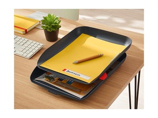Dokumentu plauktus var pakāpeniski salikt virsū, izmantojot komplektācijā iekļauto stilīgo paaugstinājumu sarkanā akcenta krāsā (papildus plaukti pieejami atsevišķai iegādei, saliekams līdz 3 paplātēm).
