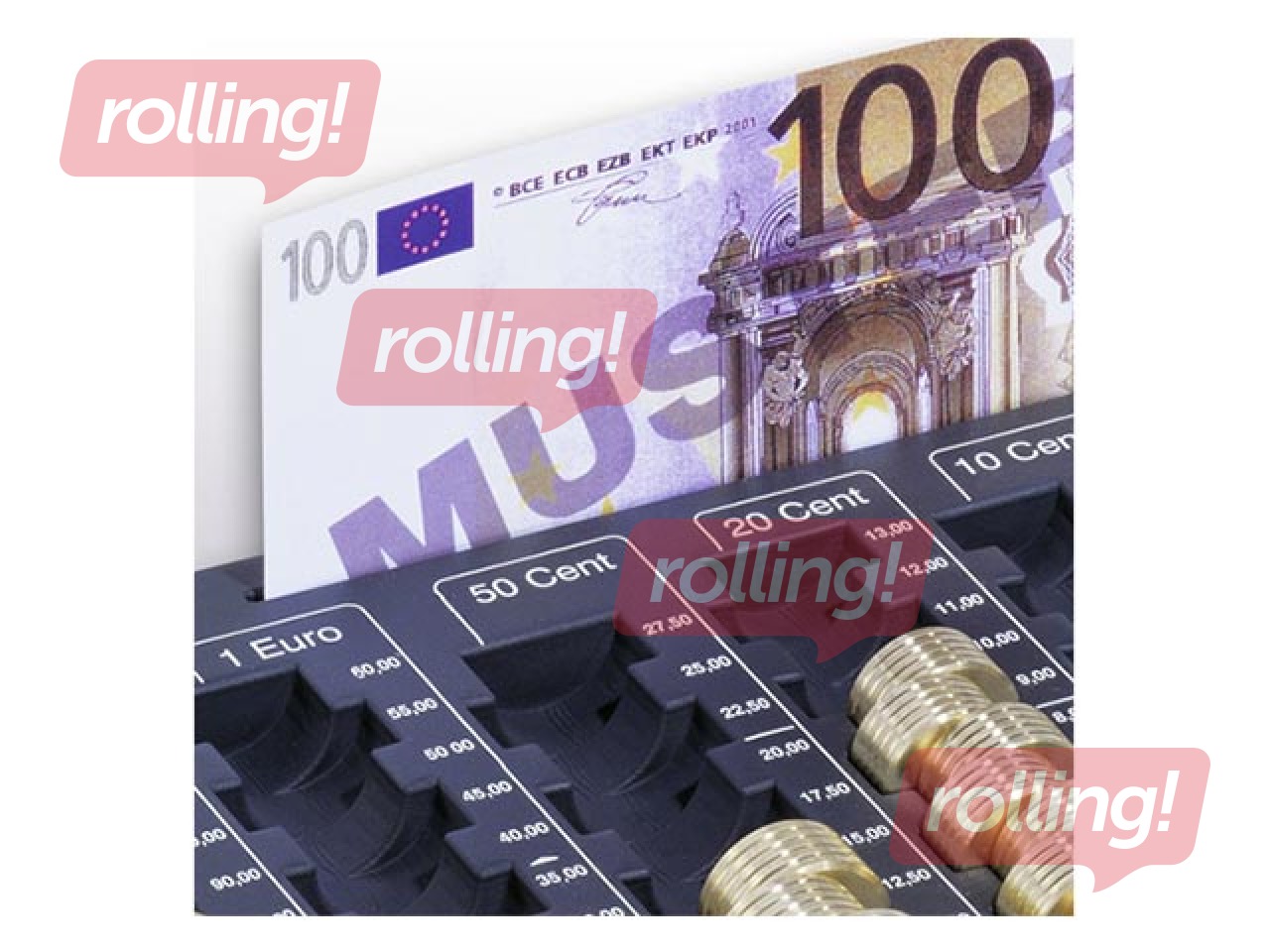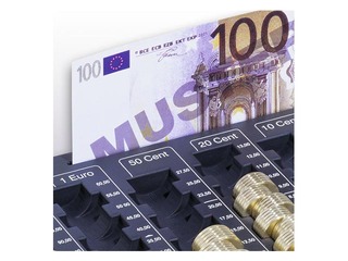 Monētu šķirošanas paplāte ar 8 nodalījumiem visiem centu un euro monētu nomināliem, komplektā ar banknošu nodalījumu pagaidu glabāšanai.