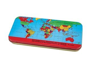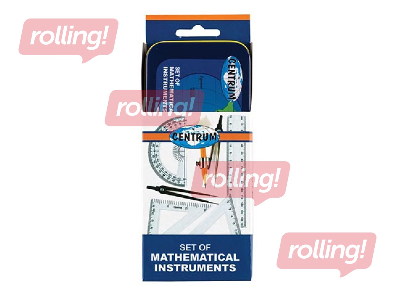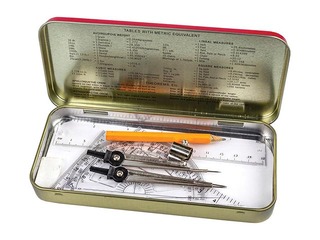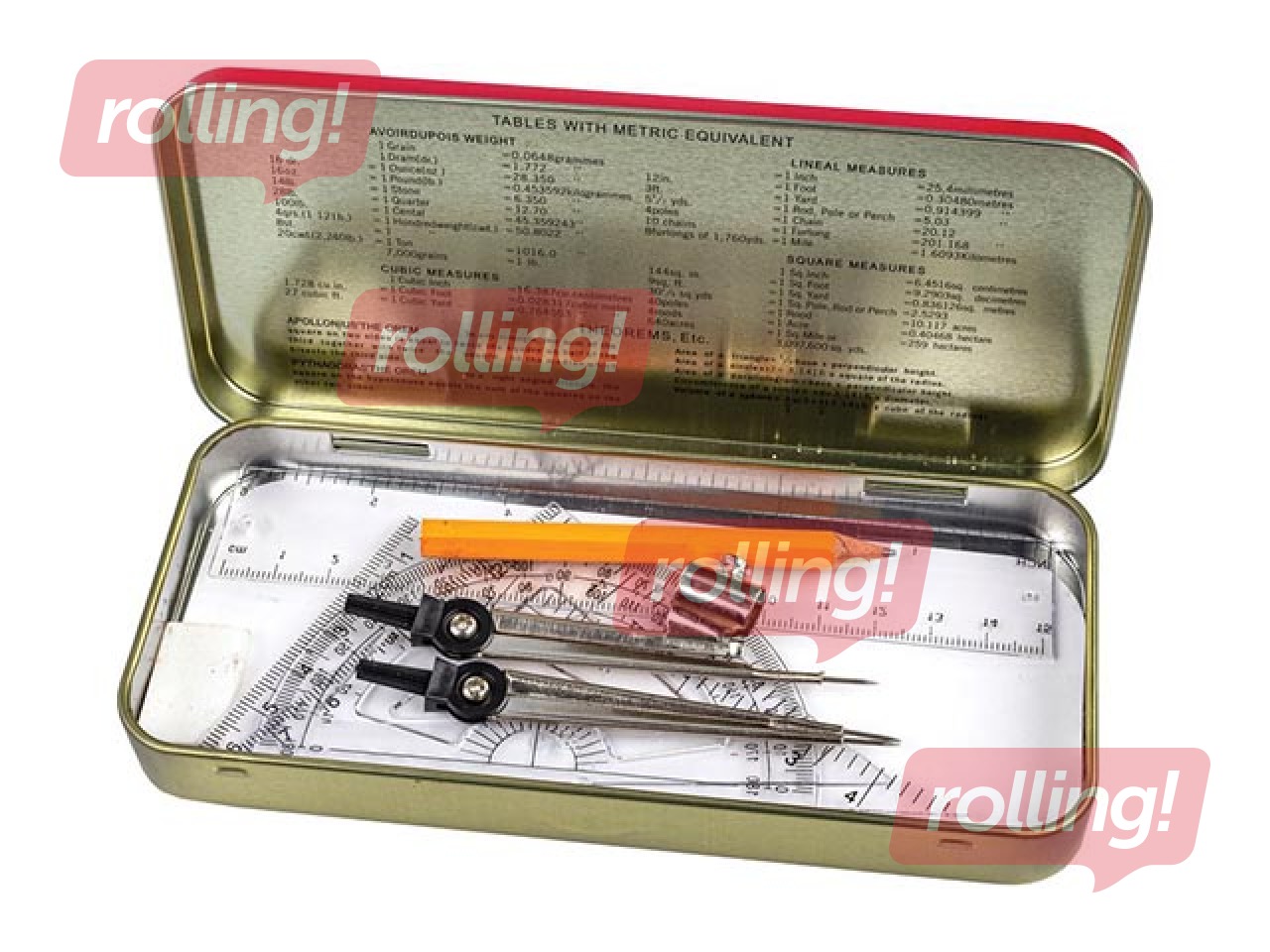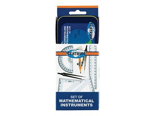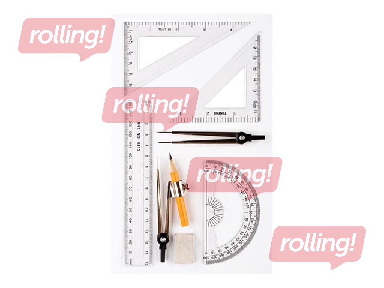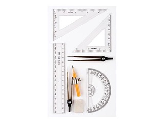 Rasēšanas komplekts: 15cm lineāls, 2 trīsstūri, transportieris, cirkulis, loka cirkulis, zīmulis, dzēšgumija