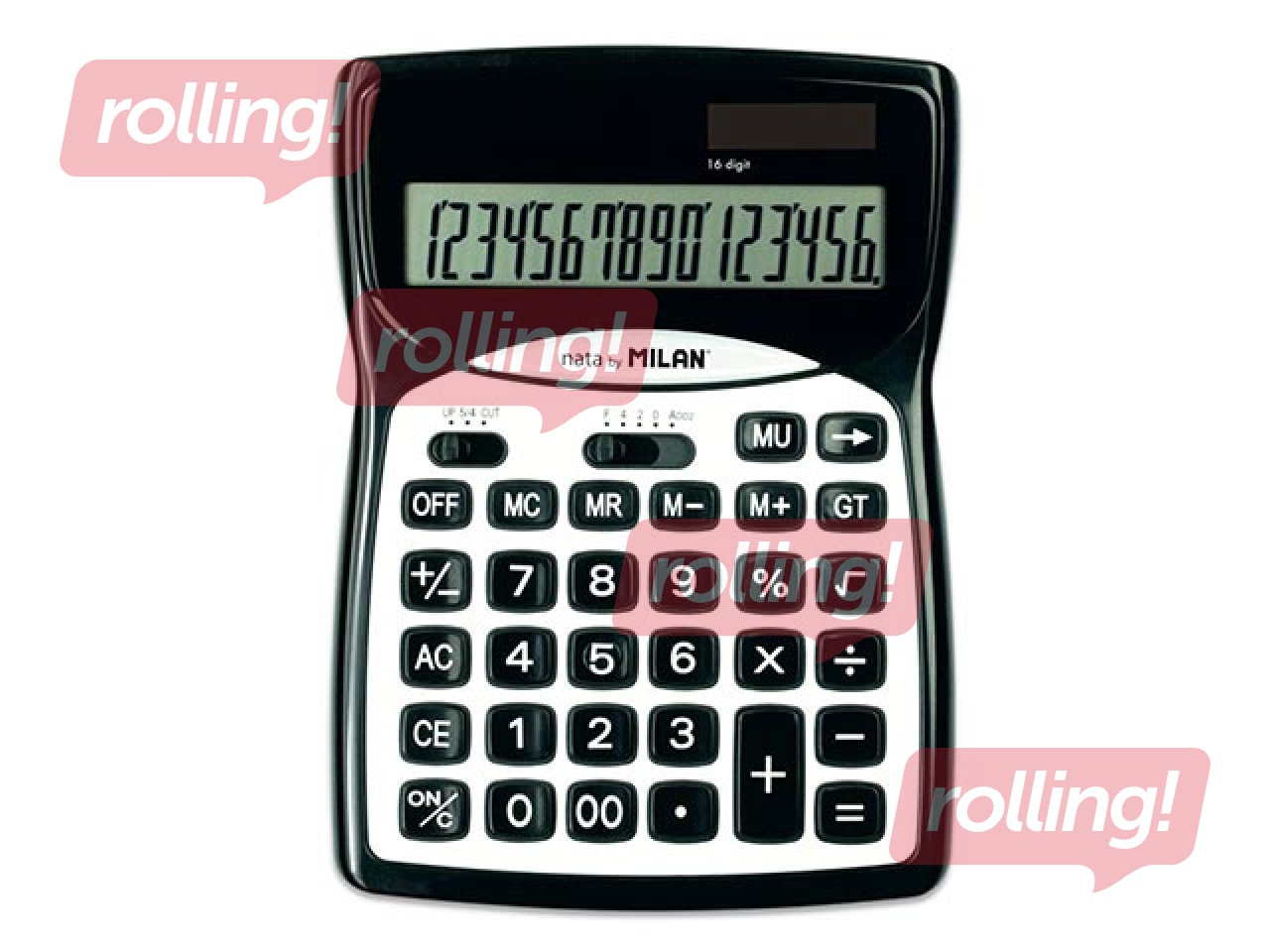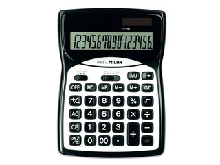 "Galda sērijas" kalkulators ar melniem plastmasas taustiņiem un baltu pamatni.