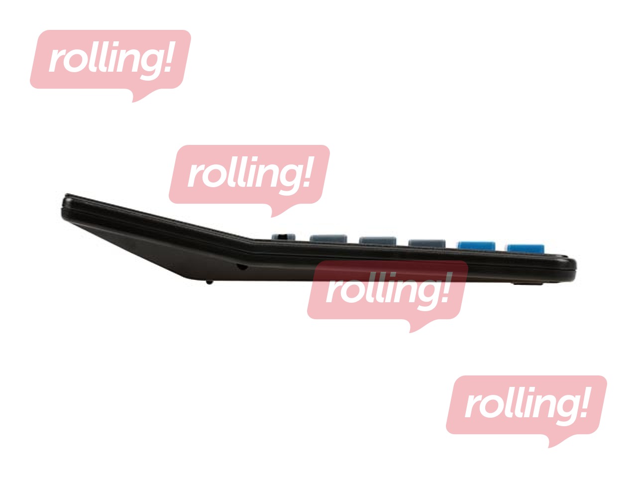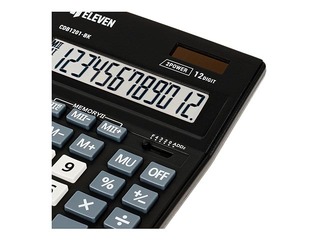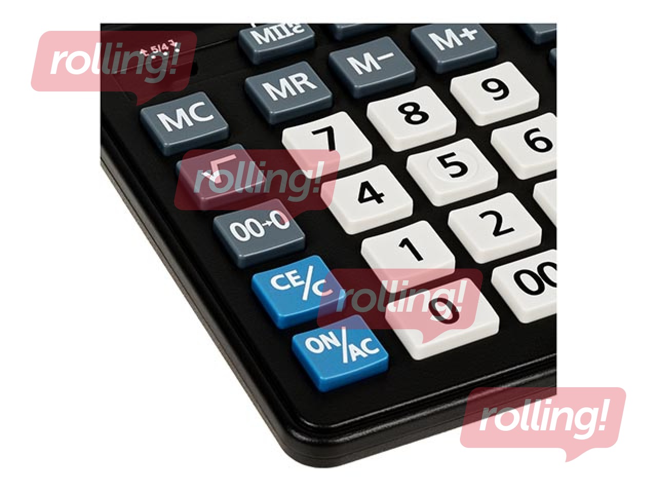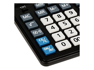"Galda sērijas" kalkulators ar plastmasas taustiņiem. Ekrāna zīmju skaits: 12. Izmērs: 205 x 155 x 35 mm, 189 g. Barošanas veids: ar gaismu un bateriju. Funkcijas:divas atmiņas; ucenojuma aprēķināšanas funkcija.