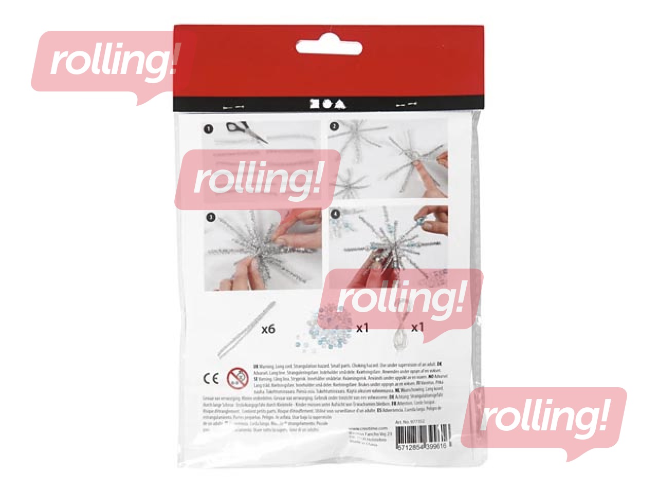 Komplektā: šenila kociņi, pērlītes dažādās krāsās un izmēros un sudraba diegs.