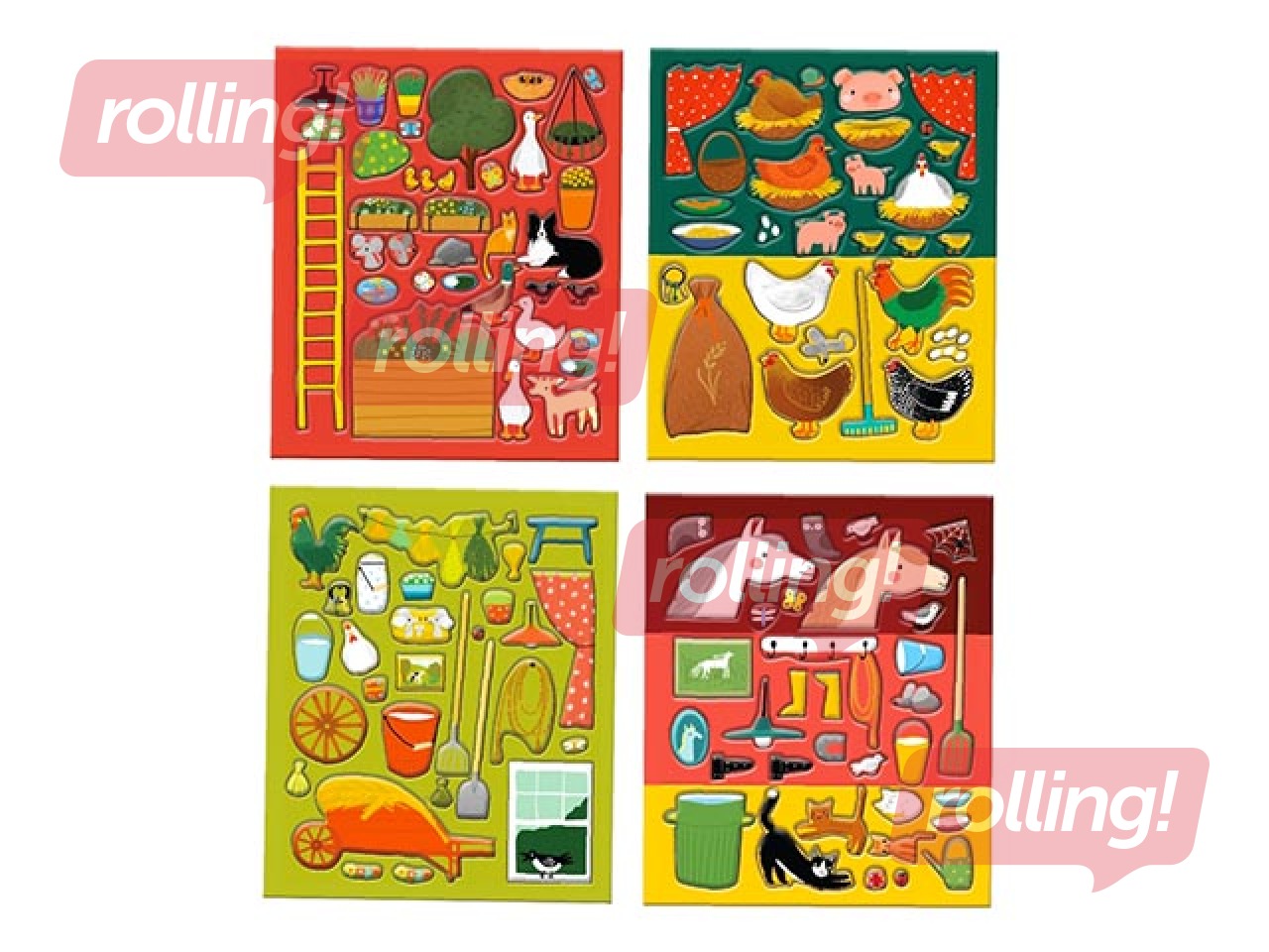 Vairākkārt lietojamas 3D putuplasta uzlīmes. Skaistu uzlīmju komplekts un 3D kartona māja ar fermas motīvu. Uzlīmes bez līmes pielīmējas pie gludas virsmas. Tāpēc tās var izmantot atkārtoti un atkārtoti uzlīmēt uz rotaļu laukuma vai uz dažādām gludām vietām. Bērni attīsta sīko motoriku un vienlaikus gūst daudz jautrības. Lieliska aktivitāte, lai radītu savu jautro pasauli. Iepakojumā ir 129 atkārtoti lietojamas putuplasta uzlīmes, 3D rotaļu kartona māja (4 istabas dekorēšanai) un 4 stāvošas figūriņas.
