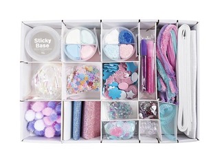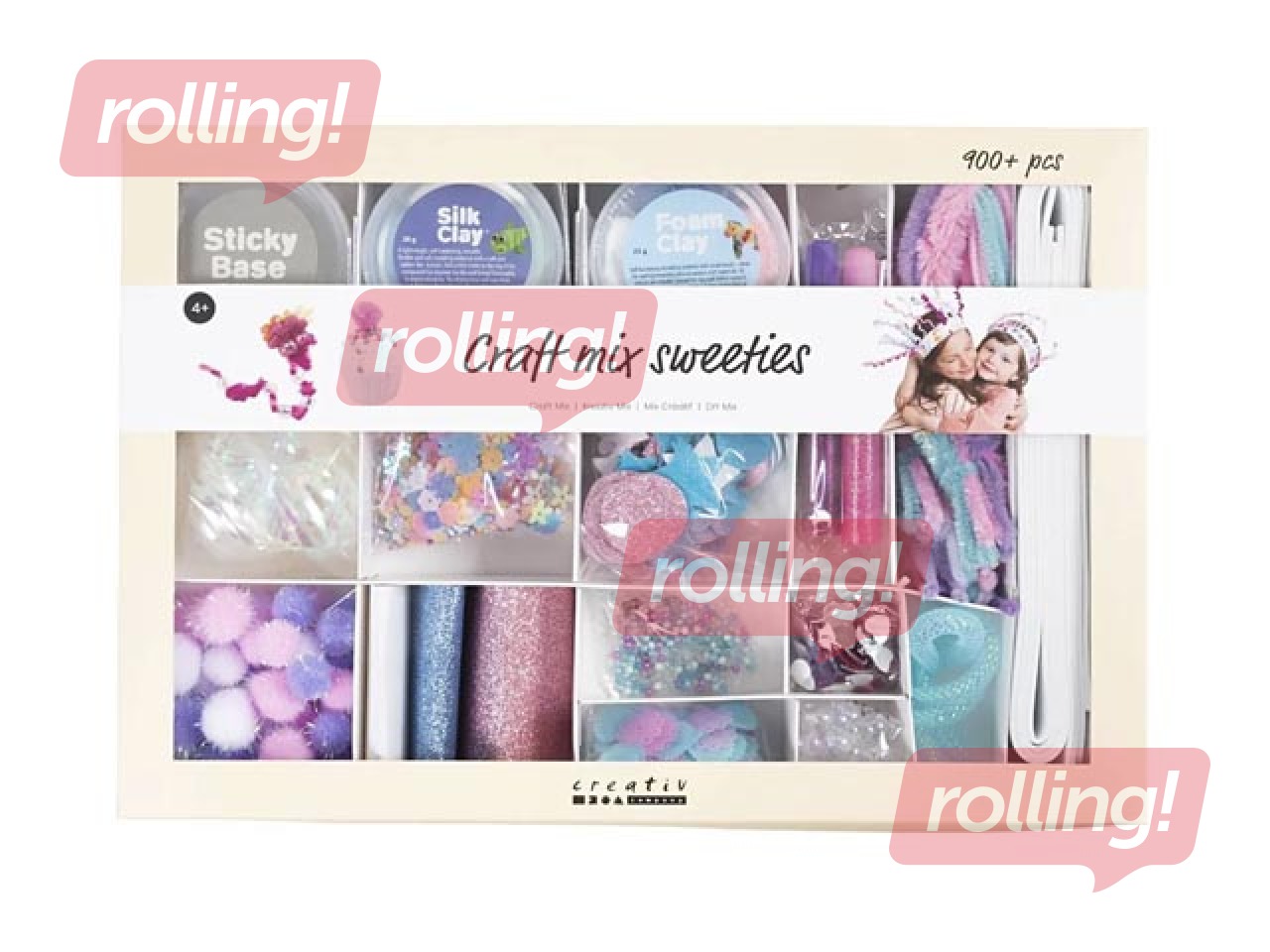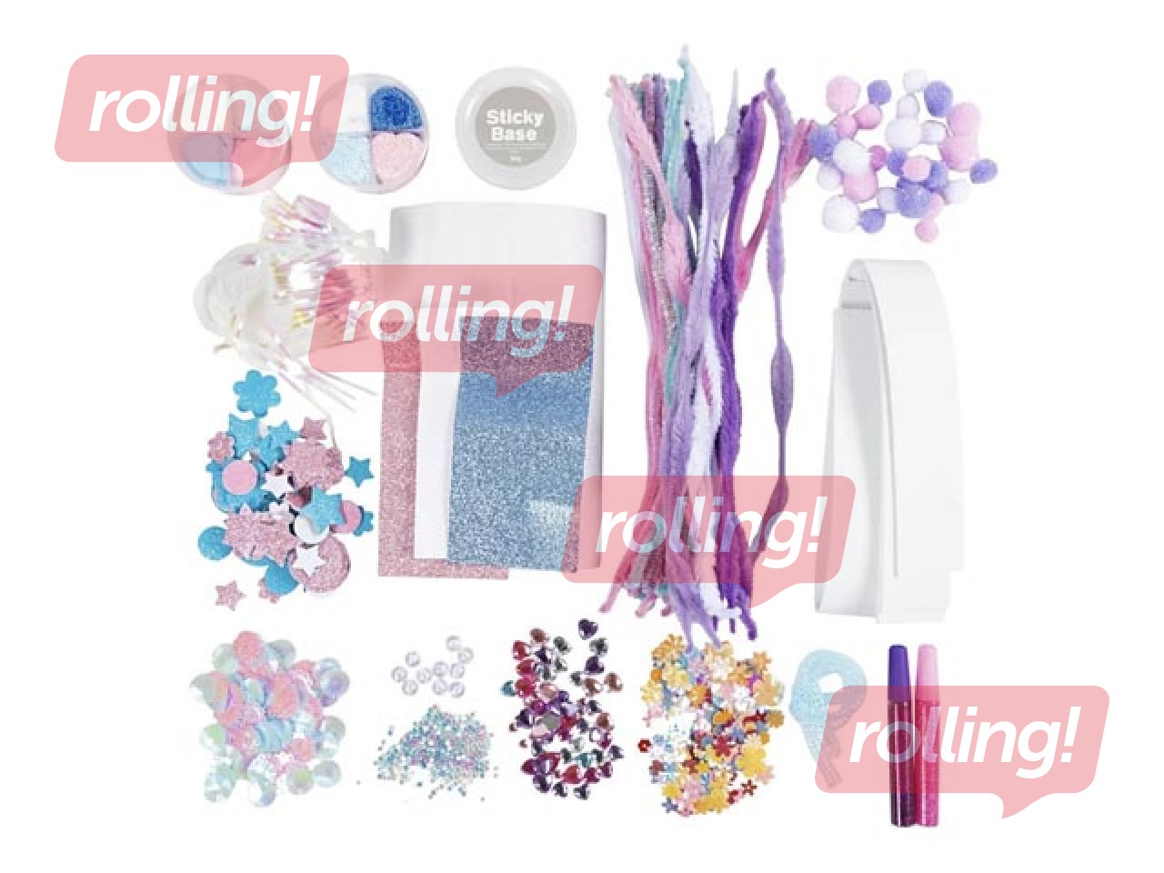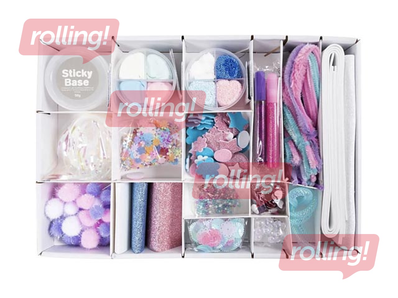 Komplektā: EVA putas, mirdzošas EVA putas, šenila kociņi, mirdzoši šenila kociņi, Foam Clay®, Silk Clay®, Sticky Base, EVA putu formas, ziedu fliteri, mirdzošs papīrs, pom-poms, pērlītes u.c. materiāli