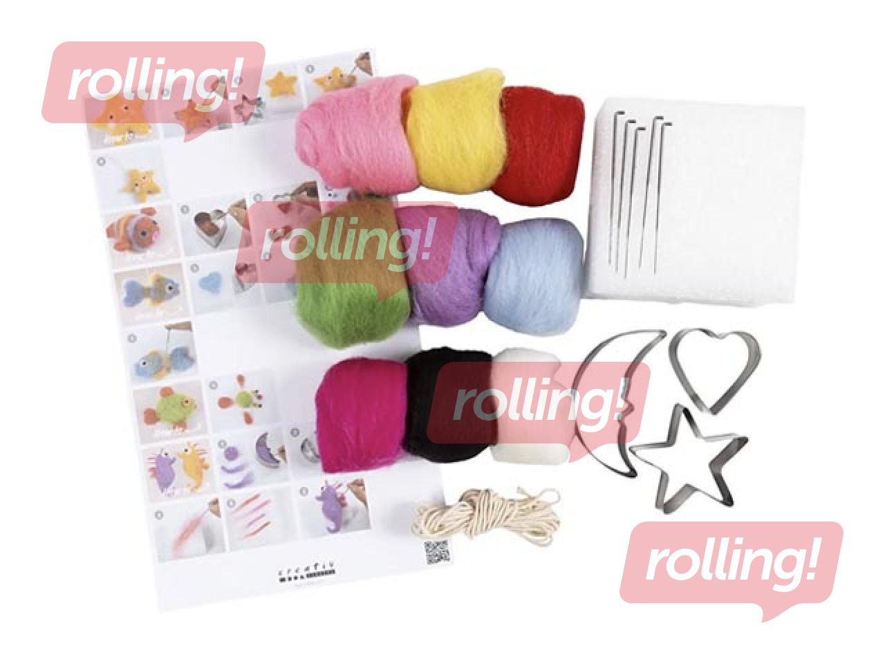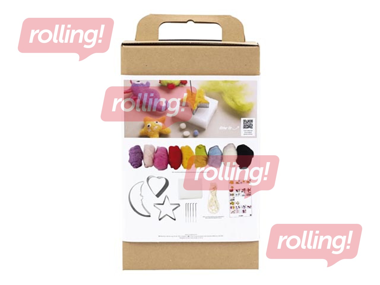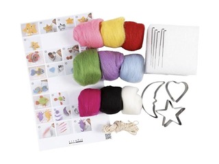 Komplektā: vilna, adatas un turētājs, filcēšanas paliktnis, trafareti.