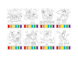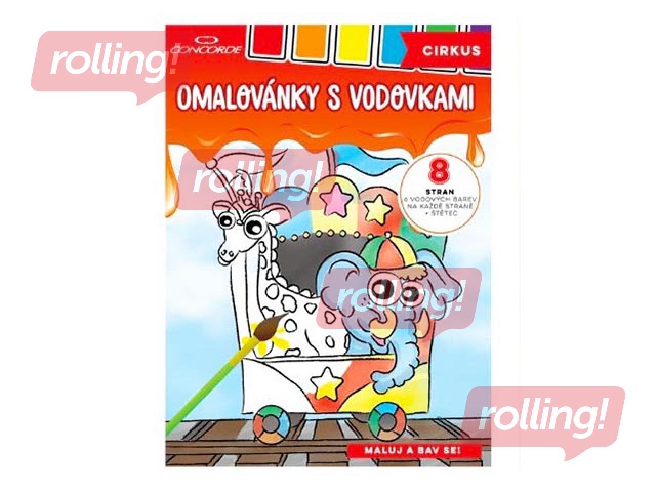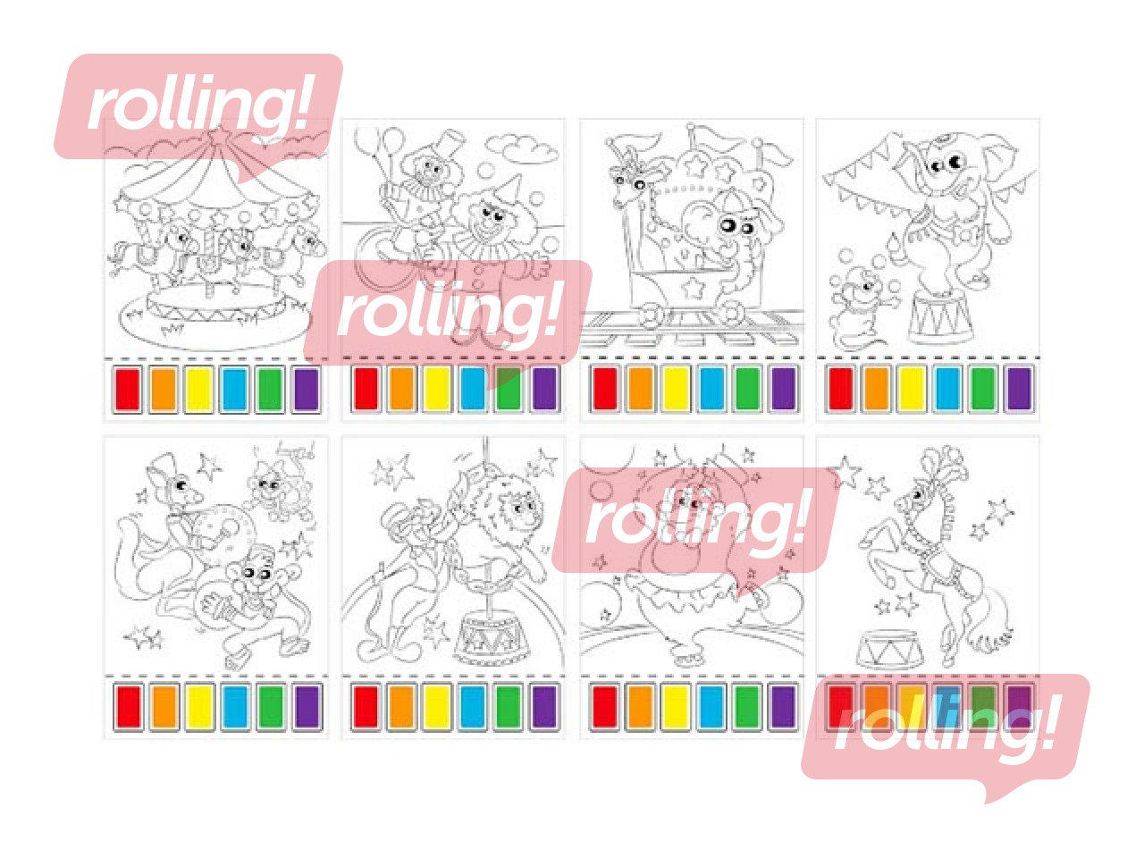 Krāsojamā grāmatiņa ar akvareļiem satur 8 jautrus attēlus ar cirka tematiku. Katra attēla apakšā ir 6 akvareļkrāsas (sarkana, oranža, dzeltena, zila, zaļa un violeta). Komplektā ir arī otiņa. Krāsojamā grāmata ir A4 formāta.
