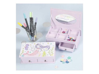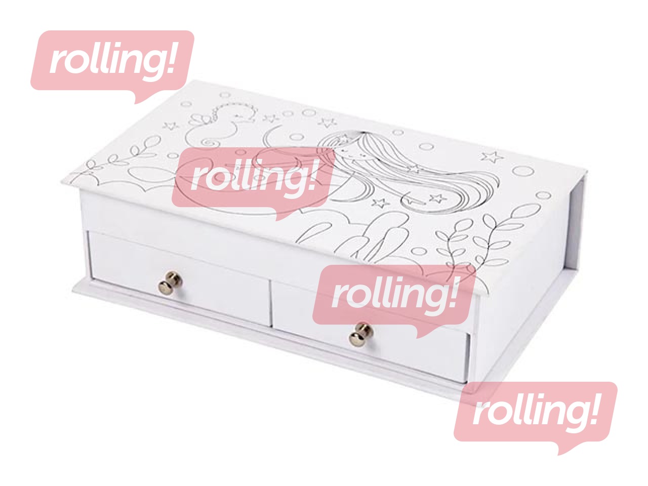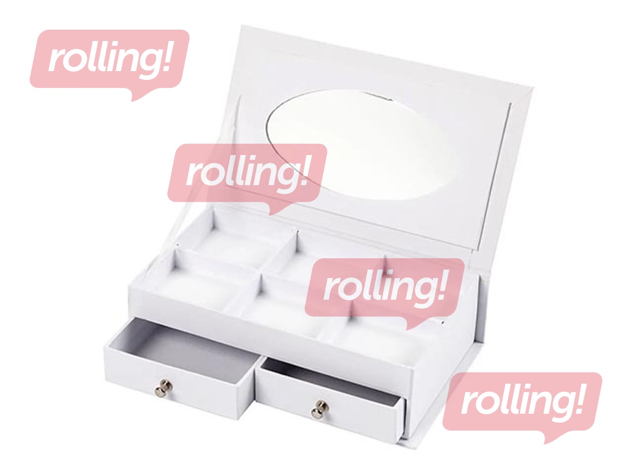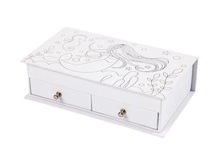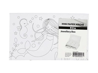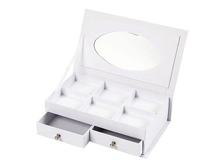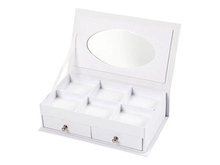 Juvelierizstrādājumu kastīte no kartona ar apdrukātu nāriņu uz vāka. Kaste sastāv no 2 atvilktnēm apakšā, 6 nodalījumiem augšpusē un spogulis vāka aizmugurē