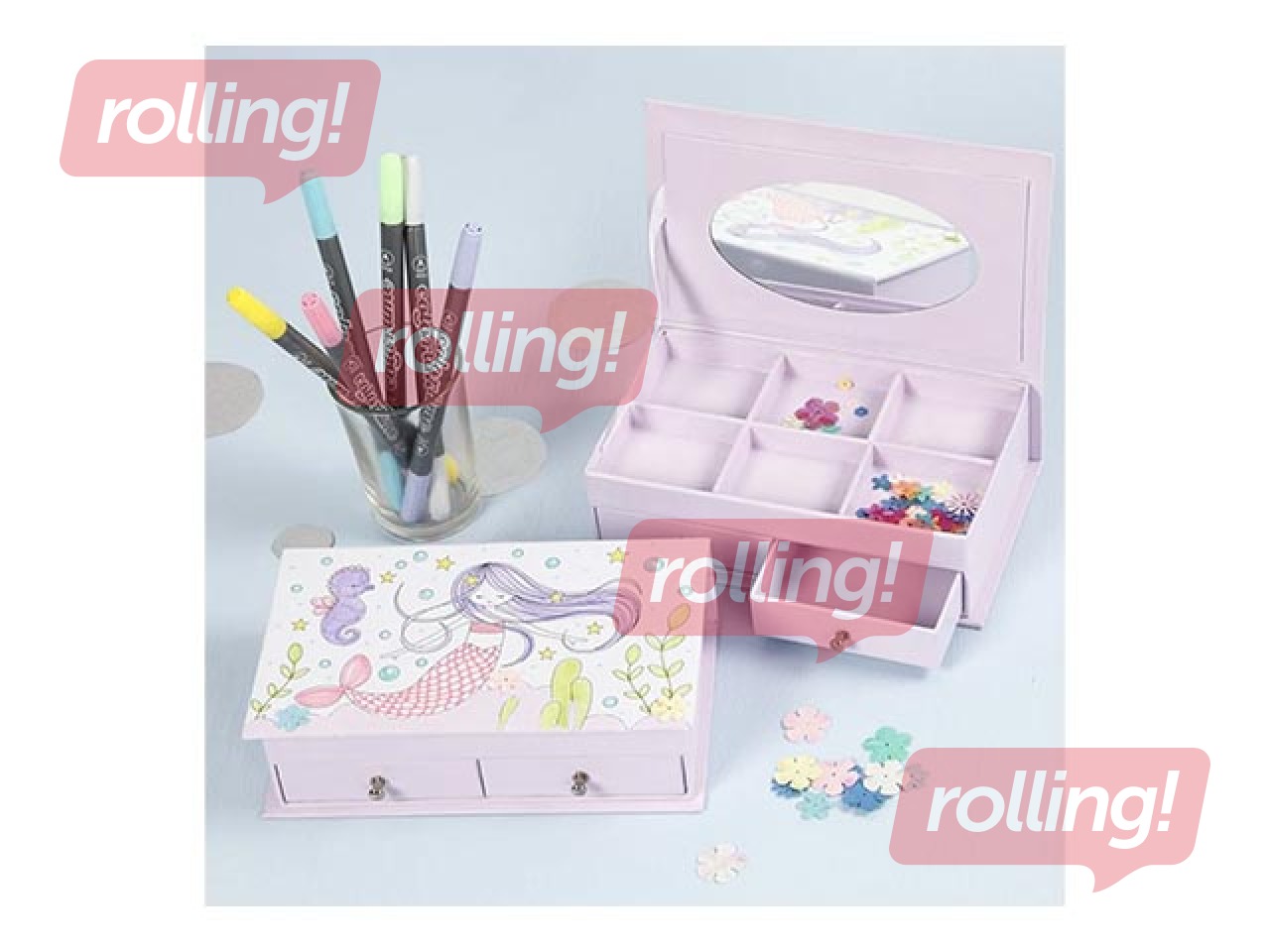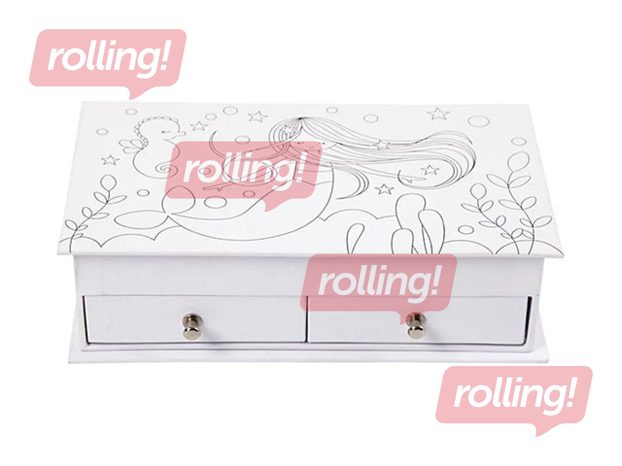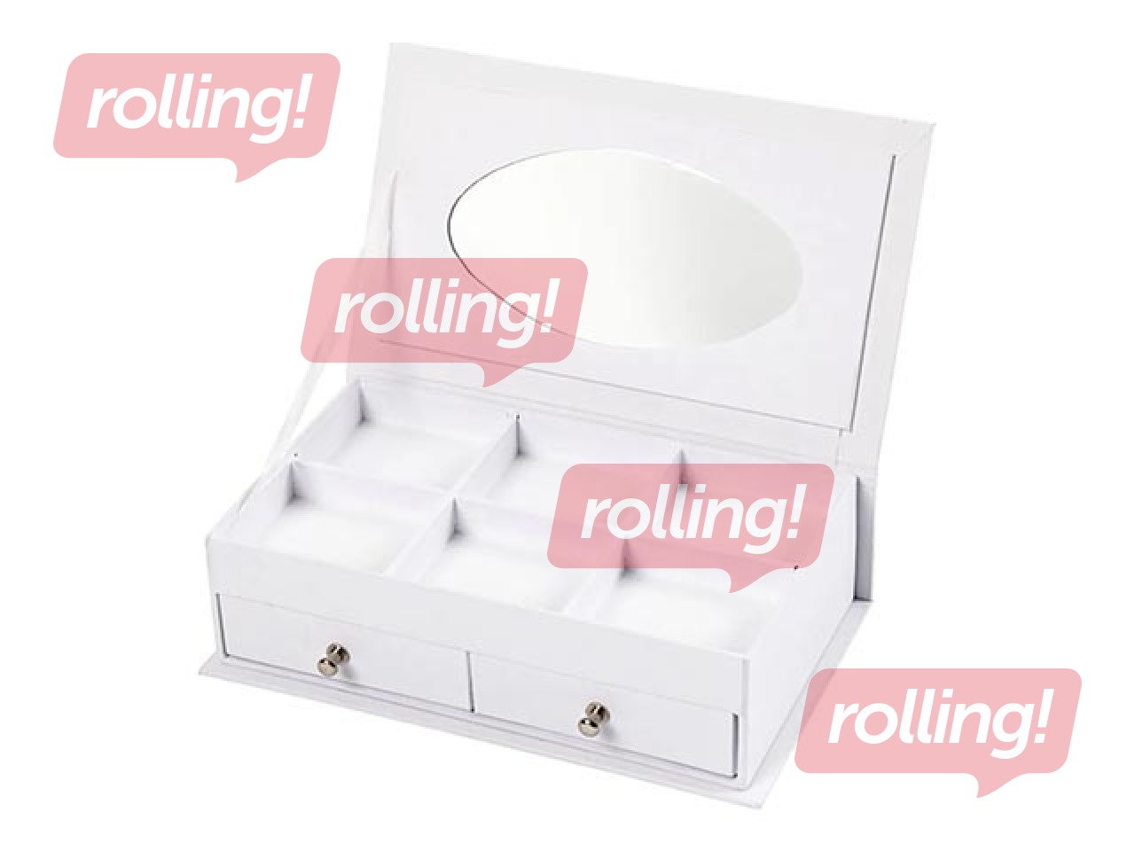 Juvelierizstrādājumu kastīte no kartona ar apdrukātu nāriņu uz vāka. Kaste sastāv no 2 atvilktnēm apakšā, 6 nodalījumiem augšpusē un spogulis vāka aizmugurē
