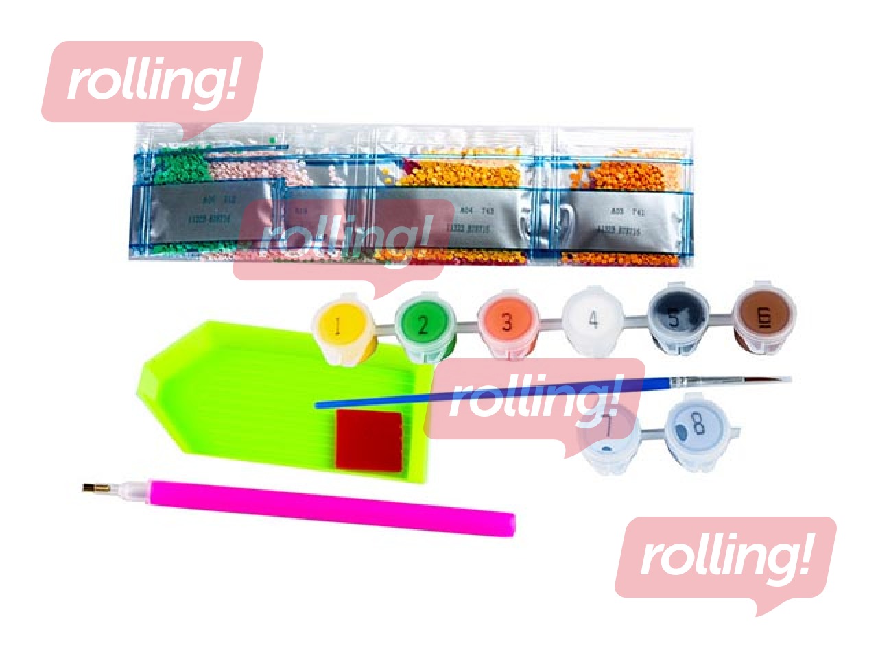 Dimanta mozaīkas komplektā ietipst : akrila krāsas, 3 otiņas, 2 āķi, akrila dimanti (rhinestones), audekls, aplikators, speciālā līme un konteiners dimantiem.