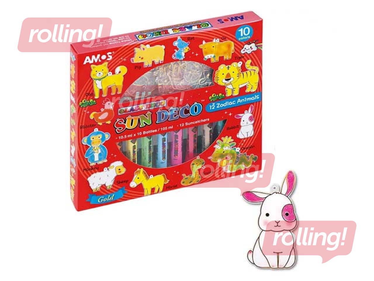 Komplektā ietilpst:12 piekariņi ar ķīniešu zodiaka zīmēm, ko krāsot, 10 krāsu krāsas ar tilpumu 10,5 ml.