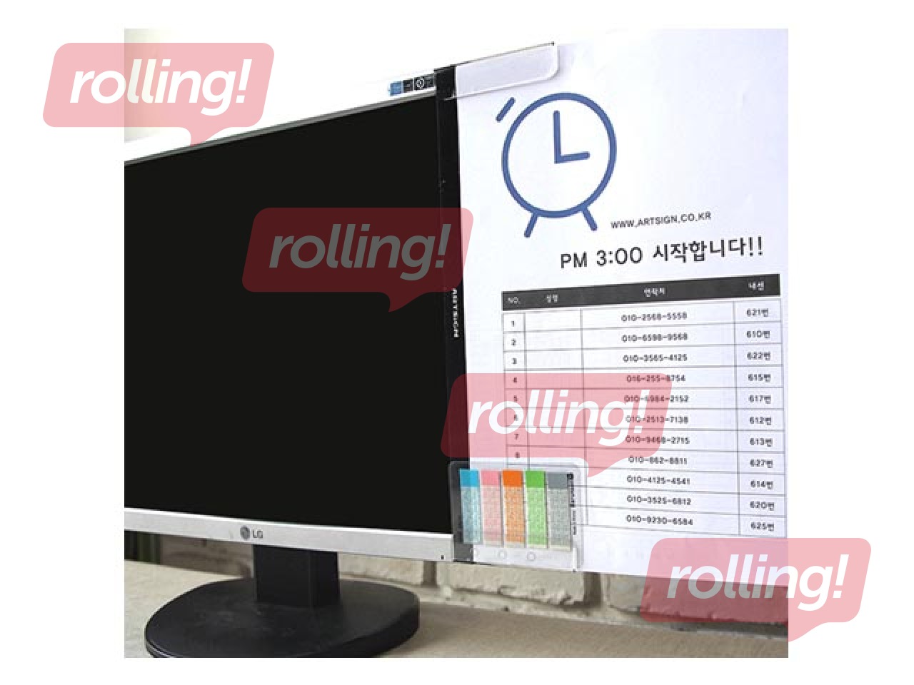 Turētājs izgatavots no caurspīdīgas plastmasas. Stiprināms pie monitora, izmantojot pašlīmējošo līmlenti (pēc noņemšanas neatstāj pēdas). Palīdz organizēt piezīmes apkārt monitoram. Aiz ielocītajām maliņām augšā un lejā var ievietot A4 dokumentus, kas būtiski atvieglo darbu, ja nepieciešams datorā ievadīt lielu informācijas daudzumu.