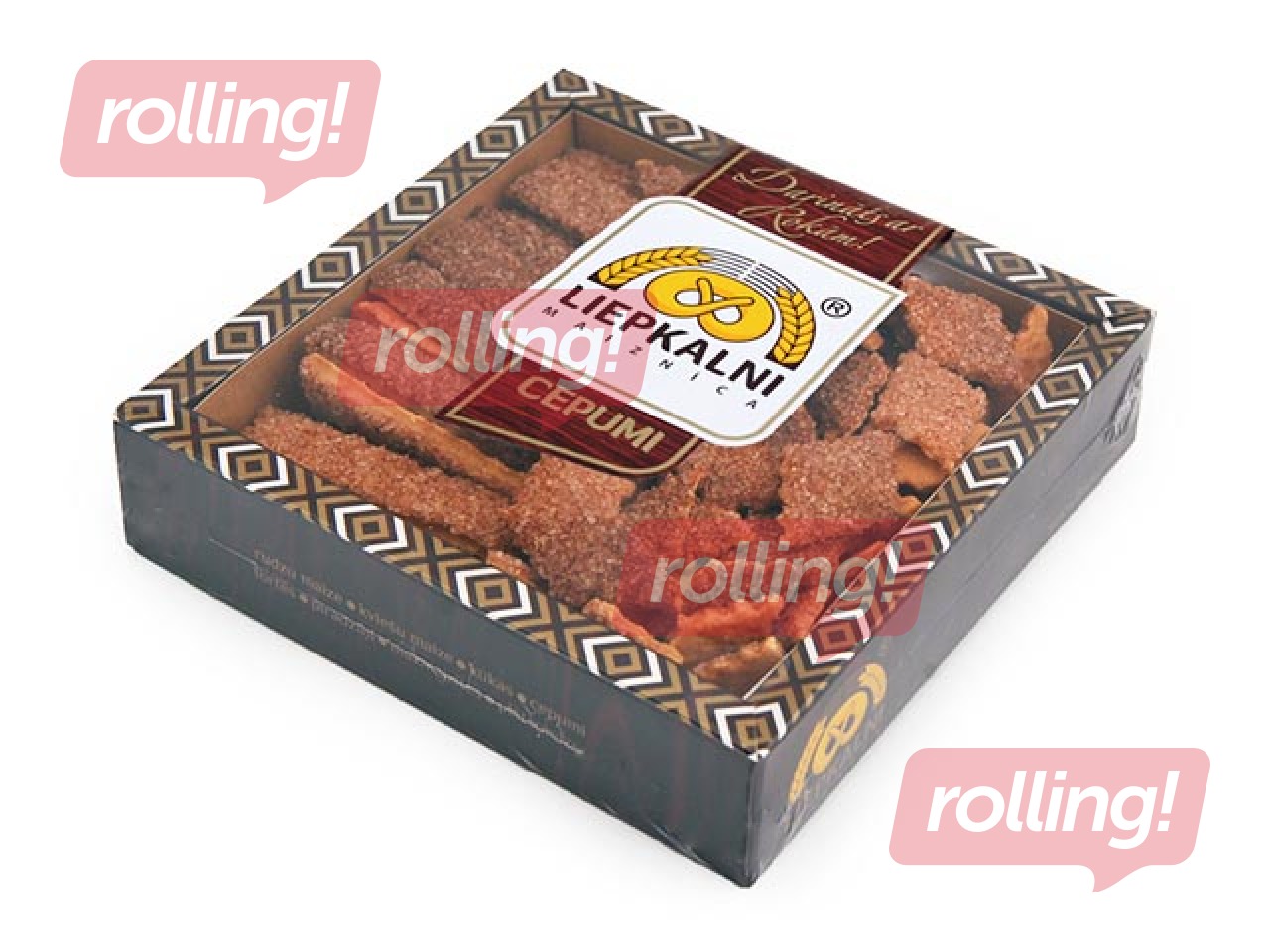 Smilšu mīklas īpaši trausli cepumi, katrs cepums rūpīgi pārklāts ar kanēļa kārtiņu kārumniekiem.