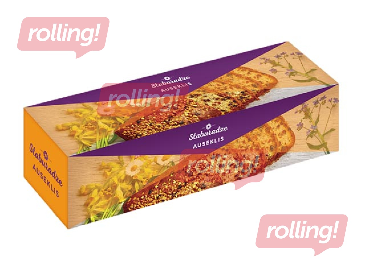 Sastāvdaļas: KVIEŠU MILTI, OLU masa, pūdercukurs, žāvētas aprikozes 13% (satur konservantu sēra dioksīdu), rozīnes (13%), margarīns (augu eļļa (palmu, rapšu, kokosriekstu), palmu tauki, ūdens, emulgatori (rapšu lecitīni, taukskābju monoglicerīdi un diglicerīdi), sāls, skābuma regulētājs citronskābe, aromatizētājs, krāsviela karotīni), SVIESTS (no PIENA), ZEMESRIEKSTI, cepamais pulveris (skābuma regulētājs dinātrija difosfāts, irdinātājs nātrija karbonāts). Var saturēt LAZDU RIEKSTU u.c. RIEKSTU daļiņas.