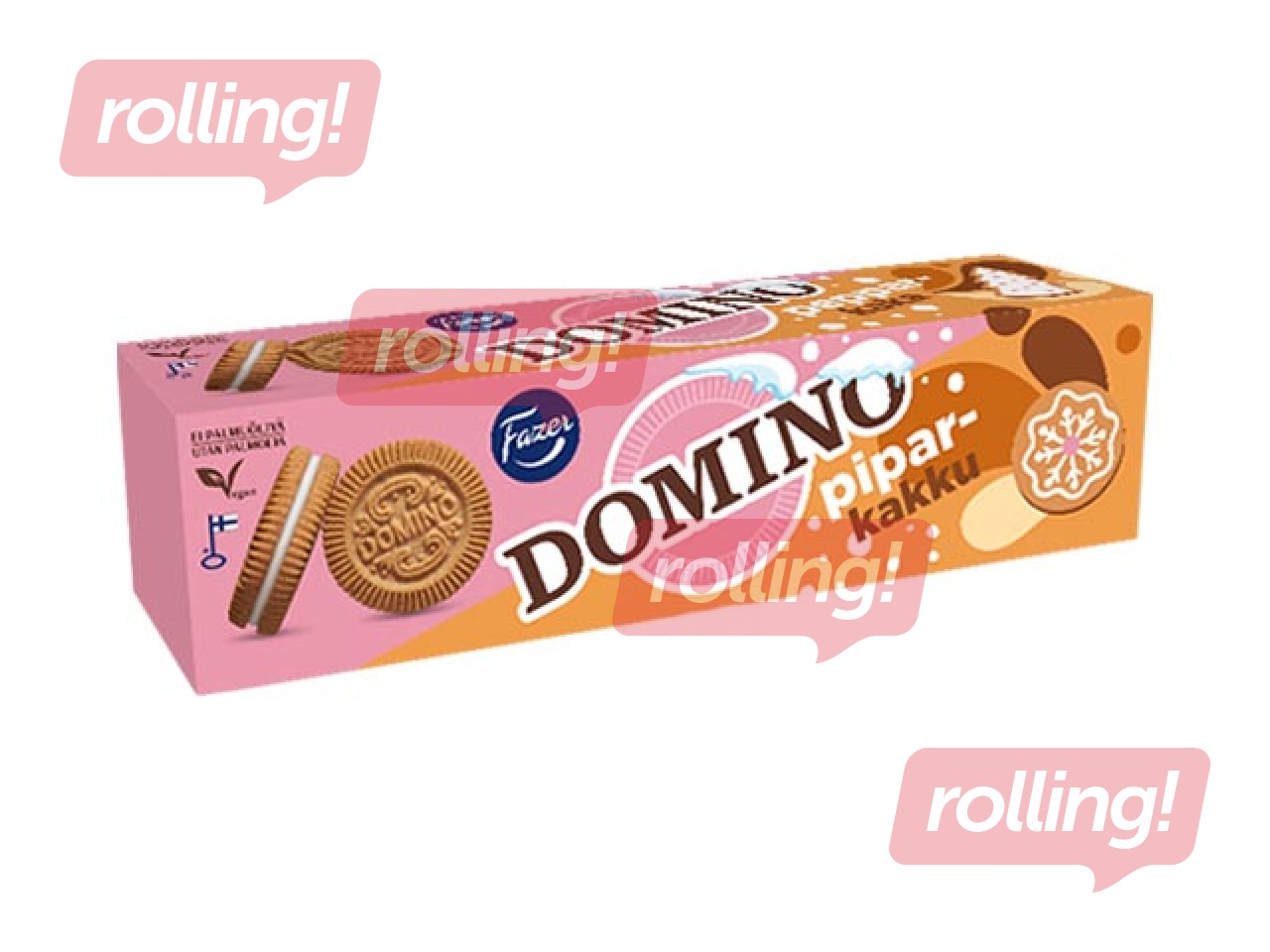 Piparkūku domino - brīnišķīgā kombinācija no piparkūku garšas cepuma un vaniļas pildījuma ar bagātīgu kanēļa garšu noteikti radīs Ziemassvētku sajūtu. Labākais ir tas, ka Domino cepumi tiek cepti bez palmu eļļas un izgatavoti no 100% atbildīgi ražotas kakao. Piemēroti vegāniem.