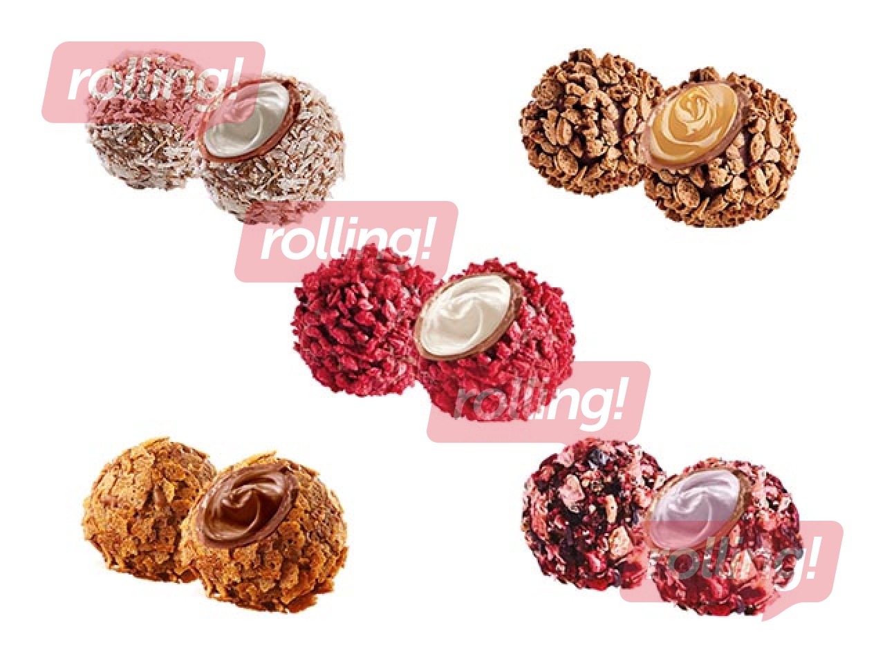 Piena šokolādes trifeles ar siera kūkas garšas krēma pildījumu un aveņu dekoru, ar karameļu krēma pildījumu un vafeļu dekoru, ar upeņu krēma pildījumu un upeņu dekoru, ar tiramisu krēma pildījumu un kraukšķīgo kafijas dekoru, ar kokosriekstu garšas krēma pildījumu un kokosriekstu dekoru.