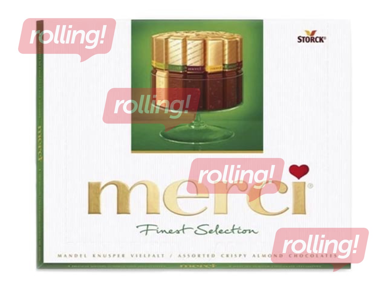 4 izsmalcināti šokolādes asortu veidi: lazdu rieksti un mandeles, baltā šokolāde un mandeļu gabaliņi, mandeļu, medus gabaliņi un mandeles tumšajā šokolādē.
