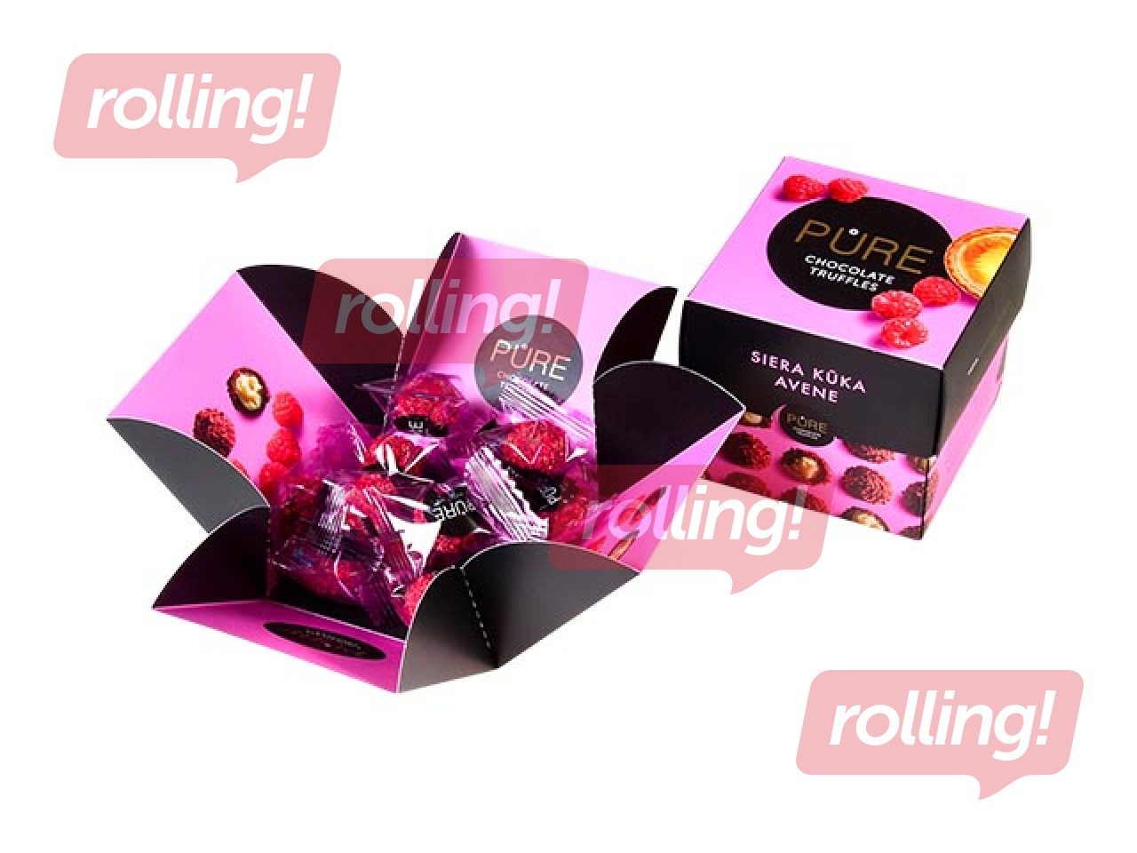 Šokolādes trifeles Pure Chocolate ar siera kūkas krēma pildījumu un aveņu dekoru, 96 g