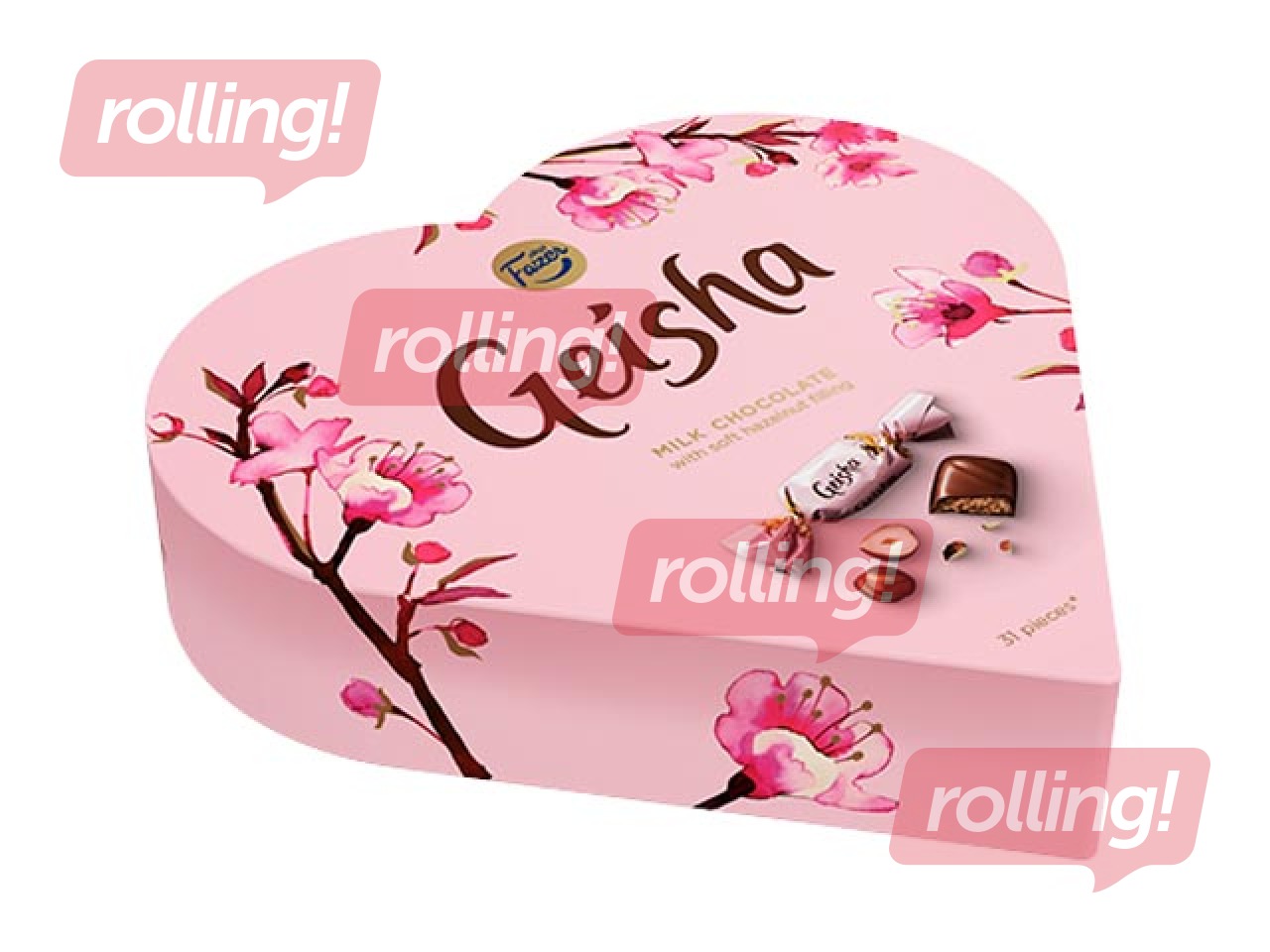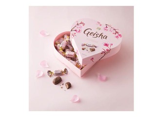 Geisha piena šokolādes konfektes apvieno samtainu šokolādes pārklājumu ar maigu, tomēr viegli kraukšķīgu lazdu riekstu pildījumu. Biezais piena šokolādes slānis lieliski papildina gardo pildījumu, radot izsmalcinātu garšas baudījumu. Sirds formas kastīte padara šo kārumu par lielisku dāvanu Valentīndienā vai citos svētkos, neprasot papildu iesaiņošanu.