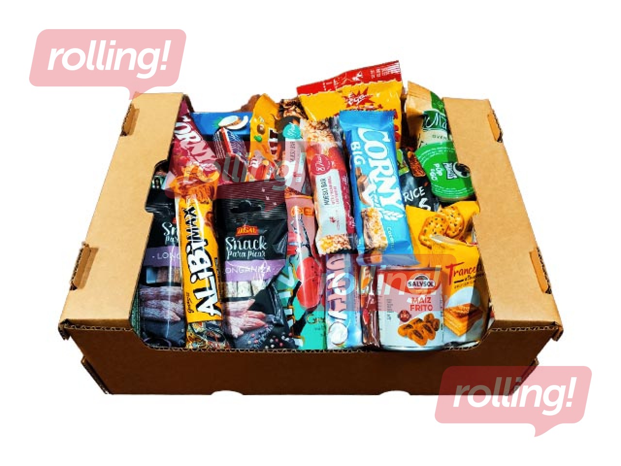 35-40 dažādas mini uzkodas: batoniņi, gaļas uzkodas, rieksti, čipsi, cepumiņi, dzērieni, u. c.