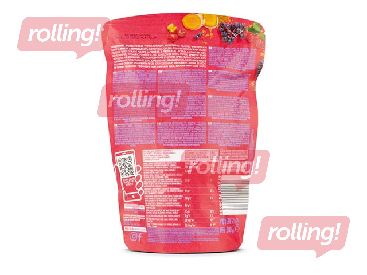 Sastāvdaļas: Grauzdētas pilngraudu pārslas (kviešu/tritikāles), glazētas, grauzdētas pilngraudu pārslas (kviešu/tritikāles) ar acerolas ķiršu un kurkumas pulveri, saulespuķu sēklas, uzpūsti speltas graudi medus glazūrā ar plūškoka sulas koncentrātu, zemesriekstu šķēlītes, žāvēti ābolu gabaliņi, zemeņu kraukšķu gabaliņi