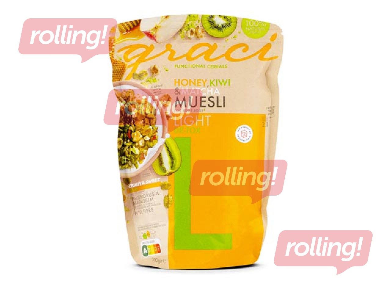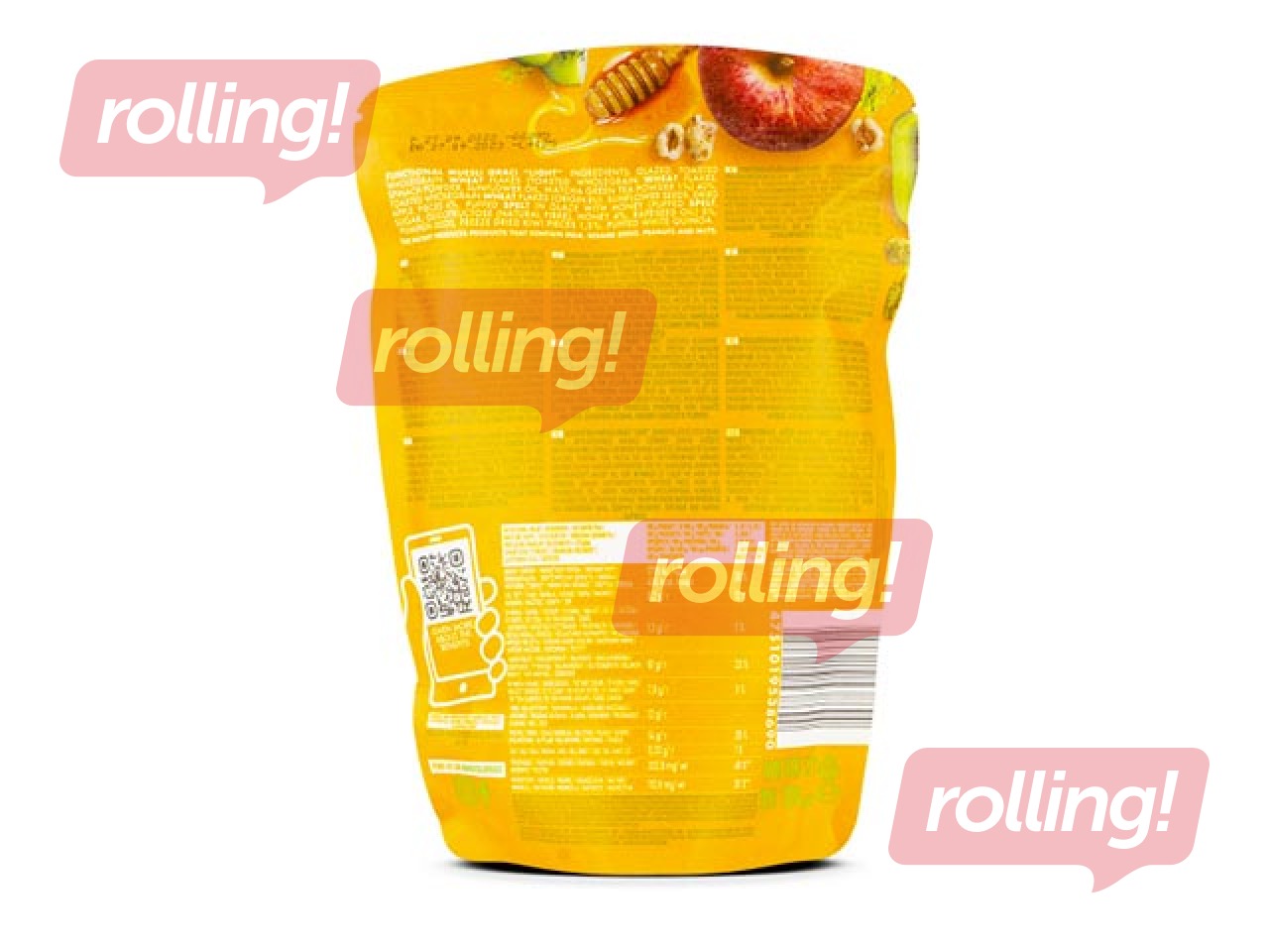 Sastāvdaļas: Glazētas, grauzdētas pilngraudu kviešu pārslas ar spinātu un mačas zaļās tējas pulveri, grauzdētas pilngraudu kviešu pārslas, saulespuķu sēklas, kaltēti āboli gabaliņos, uzpūsti speltas graudi medus glazūrā, ķirbju sēklas, liofilizētu kivi gabaliņi, uzpūsti baltās kvinojas graudi