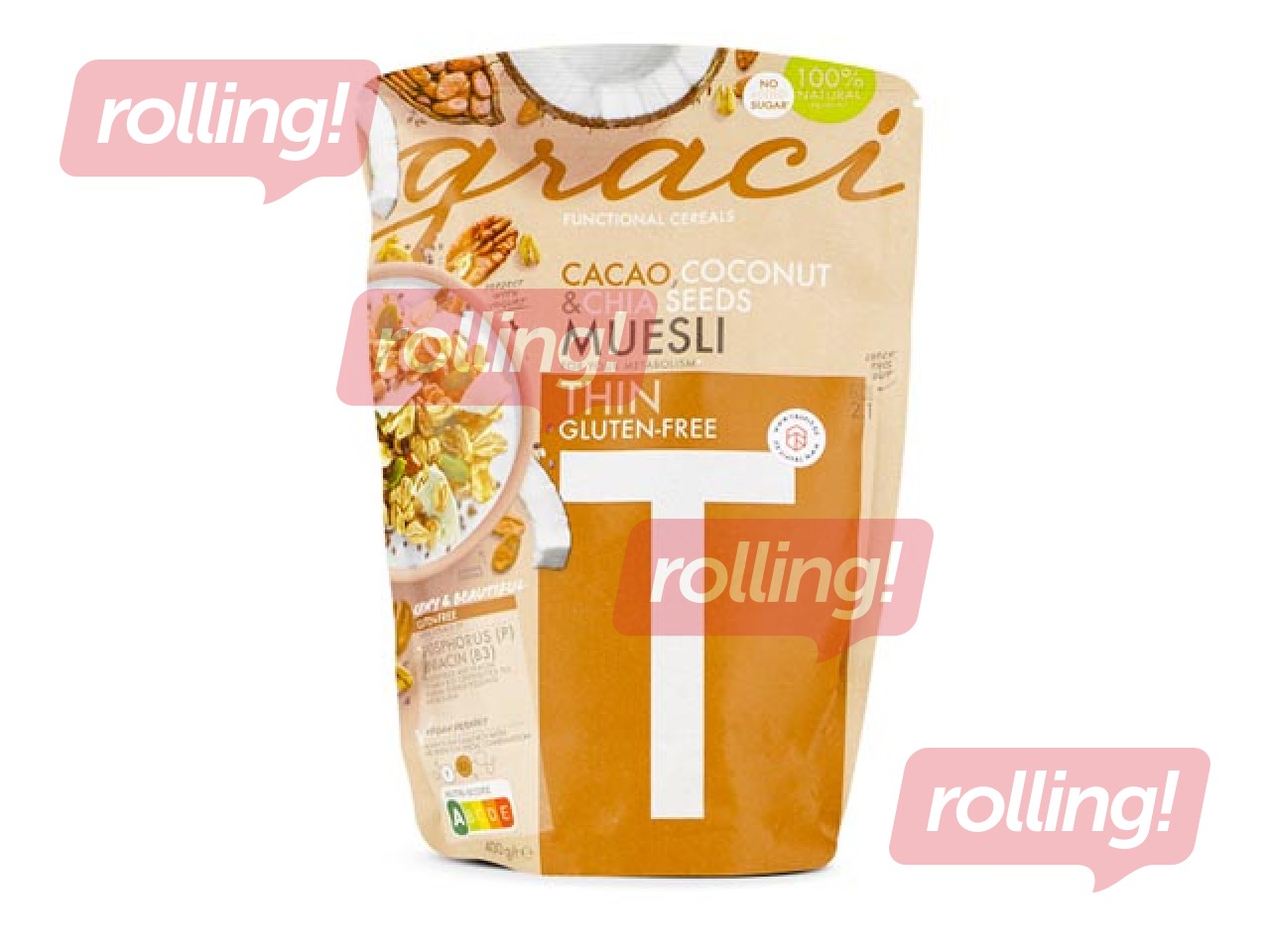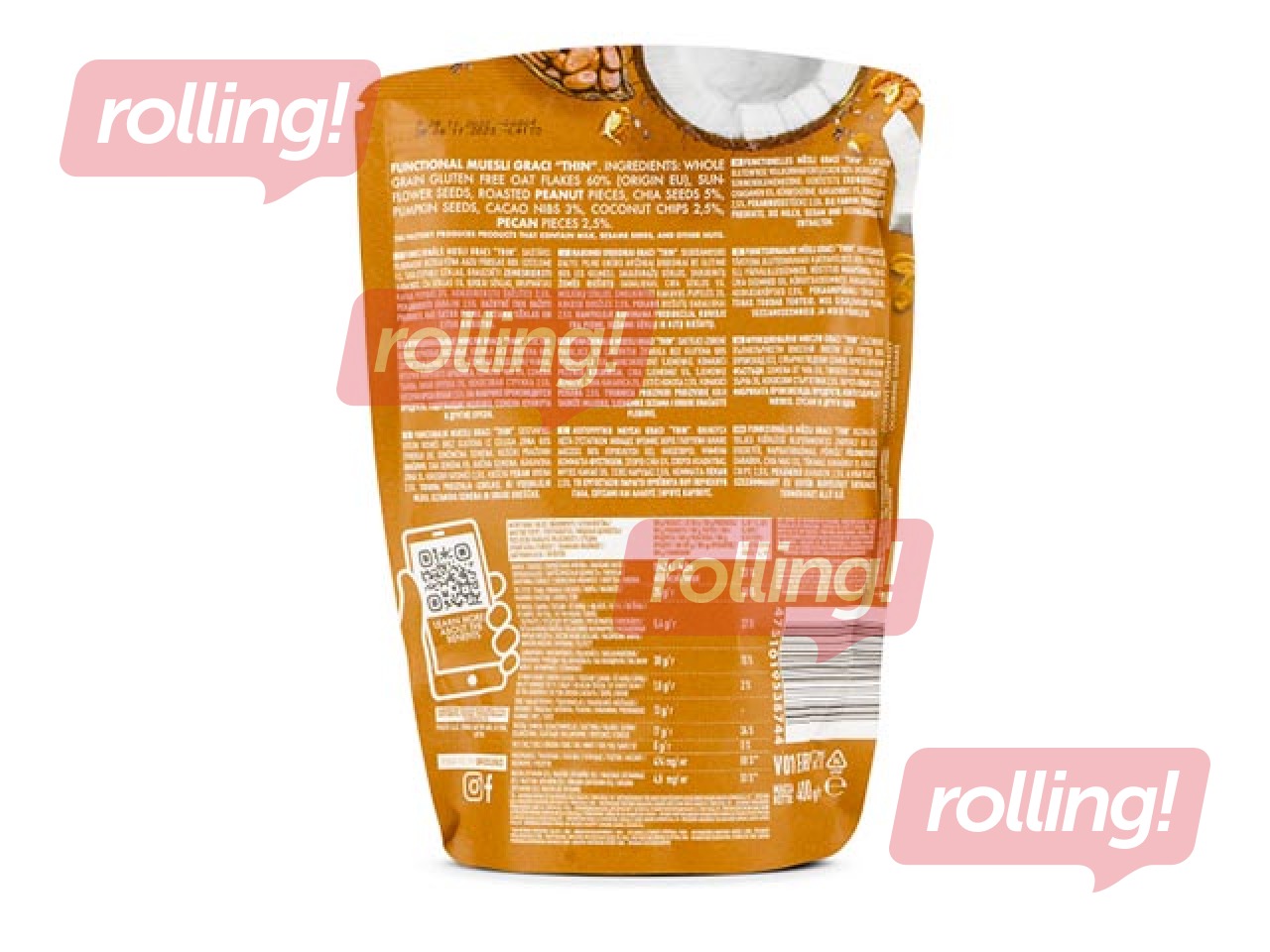 Sastāvdaļas: Pilngraudu bezglutēna auzu pārslas, saulespuķu sēklas, grauzdēti zemesrieksti gabaliņos, čia sēklas, ķirbju sēklas, drupinātas kakao pupiņas, kokosriekstu šķēlītes, pekanriekstu gabaliņi