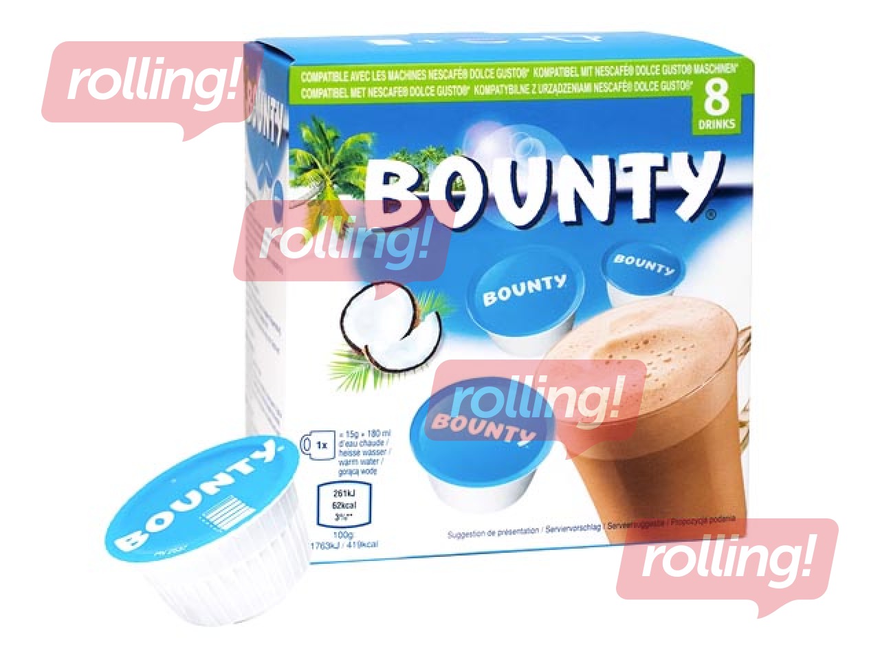 Ar Bounty® Dolce Gusto® kapsulām jūs varat kļūt par baristu mājās un vienlaikus remdēt vēlmi pēc šokolādes batoniņa! Vienā iepakojumā ir 8 Bounty® karstā šokolādes dzēriena kapsulas, astoņām 180 ml porcijām.