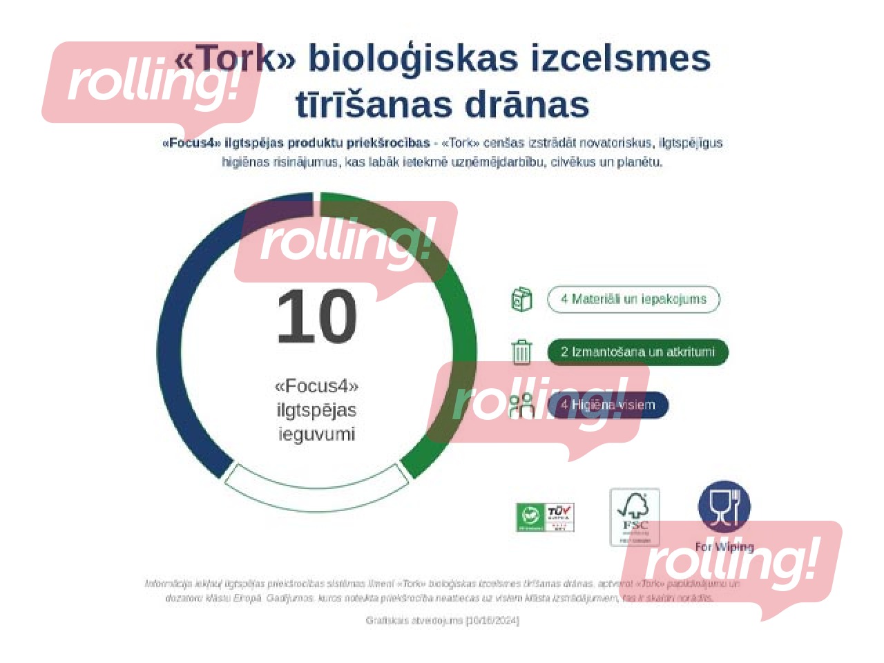 Universālās virtuves tīrīšanas drānas palīdzēs uzturēt tīrību intensīvi strādājošās virtuvēs. To biezā, uzsūcošā struktūra var ātri uzslaucīt šļakatas. Turklāt tās ir arī karstumizturīgas un neizjūk pat mitrā stāvoklī, tā garantējot drošu lietošanu. Tīrīšanas drānas ir veidotas no bioloģiskas izcelsmes* šķiedrām un iesaiņotas no pārstrādātiem materiāliem izgatavotā iepakojumā, tāpēc ļauj samazināt ietekmi uz vidi. Izmantojot ar «Tork» tīrīšanas drānu dozatoru W4 viena izstrādājuma dozēšanas funkciju, tiks samazināts arī atkritumu daudzums un veicināta higiēna. *«TÜV Austria» sertificēts «OK Biobased» produkts