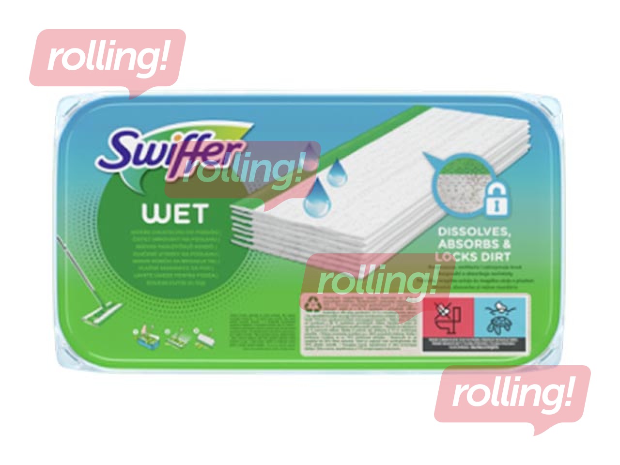 Swiffer piedāvā arī mitrās salvetes, kas samērcētas efektīvos tīrīšanas līdzekļos, kas izšķīdina netīrumus un noņem netīrumus no virsmas, aizturot tos audumā.