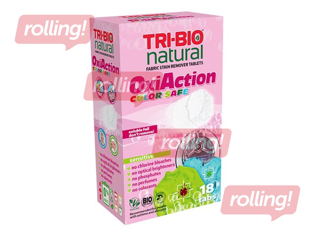 Dabīgas tabletes traipu tīrīšanai, Oxi-Action Color, Sensitive Tri-Bio, 18 tab.