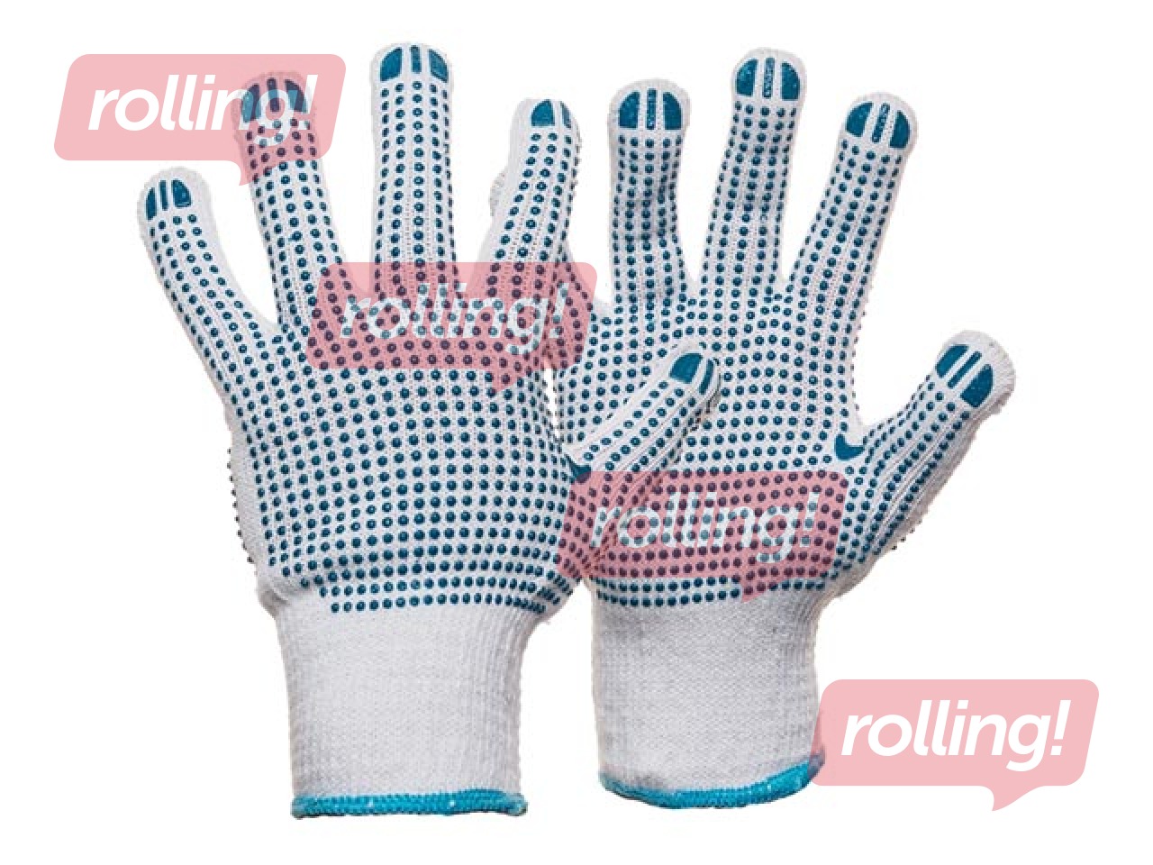 Trikotāžas darba cimdi, kas izgatavoti no kokvilnas un poliestera ar PVC punktējumu abās pusēs. Piemēroti remontdarbiem, šķirošanai, iepakošanai un dārza darbiem.