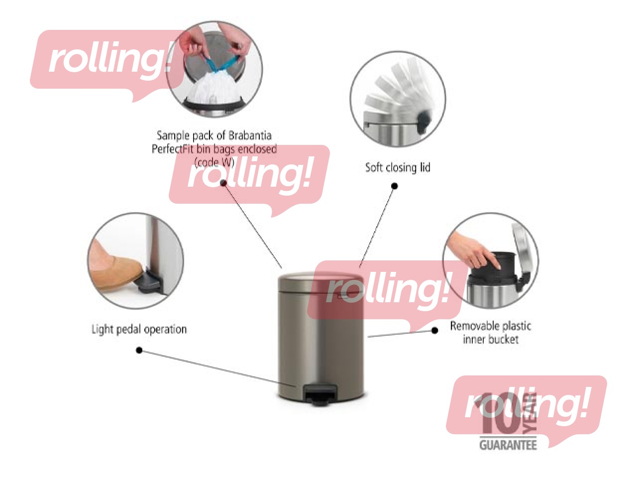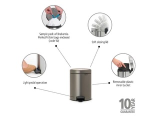 Brabantia pedāļa atkritumu tvertne NewIcon ar 5 litru tilpumu ir ne tikai stilīga un higiēniska, bet arī uzticams palīgs ikdienā. Tā ir stabila, ar neslīdošu pamatni un pretapgāšanās mehānismu. Vāks cieši noslēdzas, nepieļaujot nepatīkamu aromātu izplatīšanos, un aizveras klusi. Pateicoties vieglajai pedāļa darbībai, tvertne ir ērti lietojama. Elegants dizains, kas iederēsies vannasistabā, tualetē vai bērnu istabā.