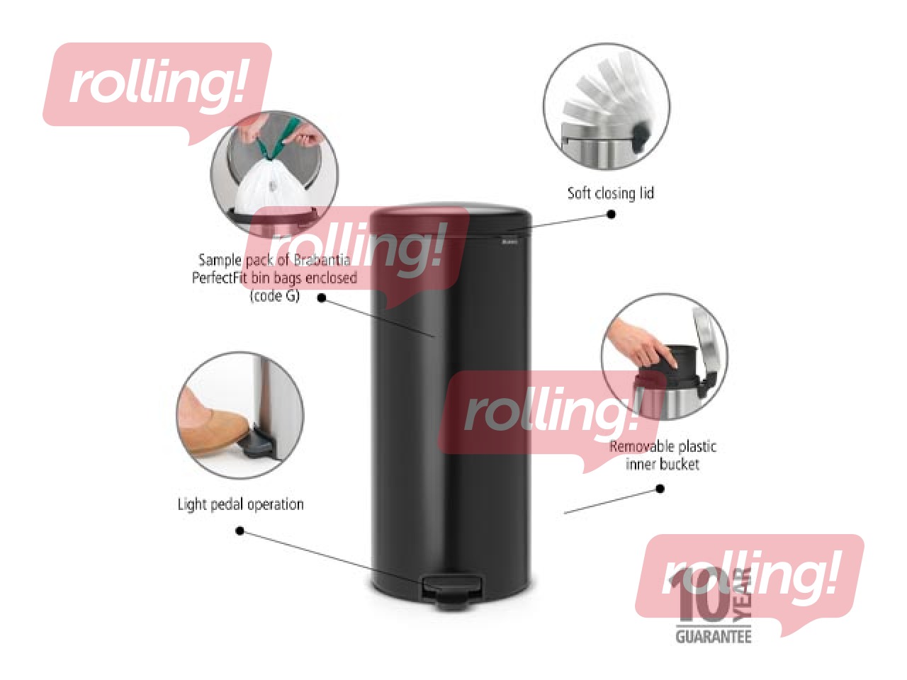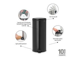Brabantia pedāļa atkritumu tvertnei NewIcon ar 30 litru ietilpību ir ikonisks dizains un tā ir uzticams palīgs ikdienā. Stabilitāti nodrošina neslīdošā pamatne un pretapgāšanās bloks. Pateicoties īpašajai klusās aizvēršanās funkcijai, vāks aizveras vienmērīgi un klusi. Tvertne ir higiēniska, smaku necaurlaidīga, viegli atverama un kopjama. Ideāli piemērota virtuvei vai jebkurai citai telpai, kur nepieciešama ietilpība un stils.