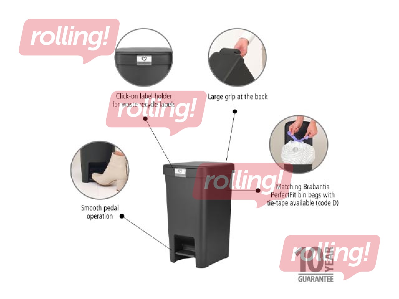 • Bez liekiem pārklājumiem – sader ar Brabantia PerfectFit maisiņiem ar sasienamo lenti
