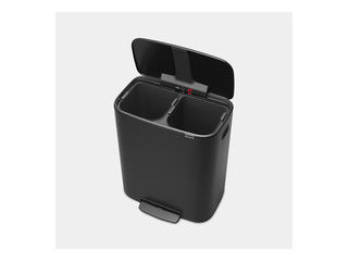 Brabantia Bo divdaļīgā atkritumu tvertne ar pedāli, 2x30litri. Efektīvs un elegantīgs risinājums atkritumu šķirošanai mājās vai birojā. Šai tvertnei ir divas atsevišķas, viegli izņemamas 30 litru iekšējās kastītes, kas ļauj ērti šķirot atkritumus. Pateicoties tās plaknajai aizmugurei, tvertne perfekti pieguļ pie sienas vai stūrī, maksimāli taupot vietu.