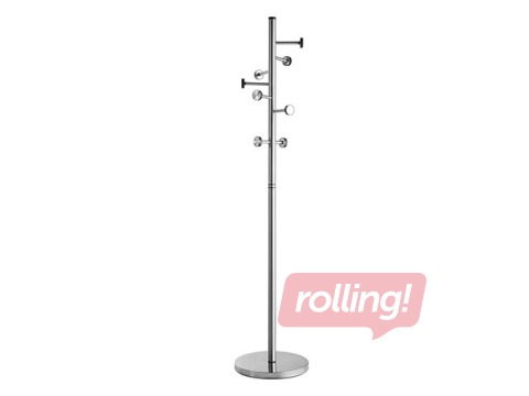 Mēteļu statīvs no nerūsējošā tērauda, matēta virsma, smagu apaļa pamatne, 8 mēteļu āķi ar apaļiem diskiem galos (diametrs 5,5 cm).