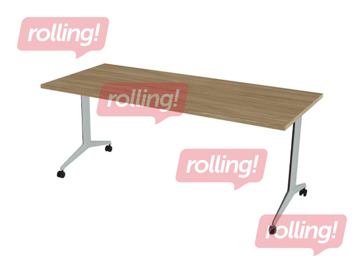 Ērti lietojams konferenču galds ar nolokāmu virsmu, piemērots sapulču, apmācību vai darba telpām. Visā metāla rāmja garumā iestrādāts rokturis, kas ļauj viegli un ar vienu roku nolocīt virsmu. Galds ir aprīkots ar riteņiem ērtai pārvietošanai, bet stabils dizains nodrošina drošu lietošanu. Pieejams ar taisniem vai noapaļotiem stūriem dažādos virsmas toņos un izmēros. Galda virsma ozola dekorā, rāmis – pelēks.