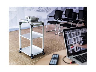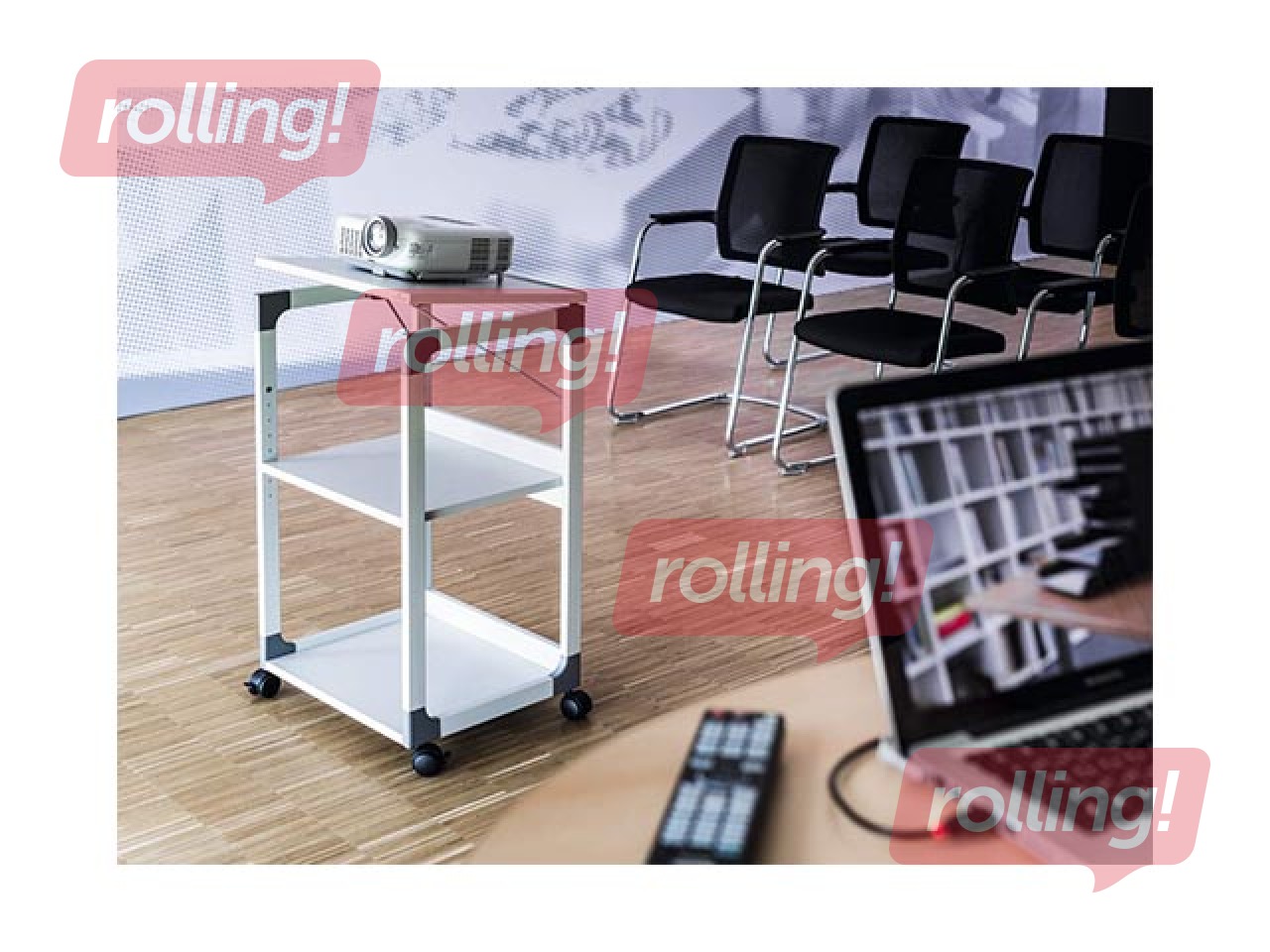 • Daudzpusīga izmantošana, pateicoties regulējamam vidējam plauktam (32 mm attālums) un iespējai pielāgot projektoru augšējā plaukta slīpuma leņķi vai izlocīt to par 180°, lai izmantotu kodoskopu