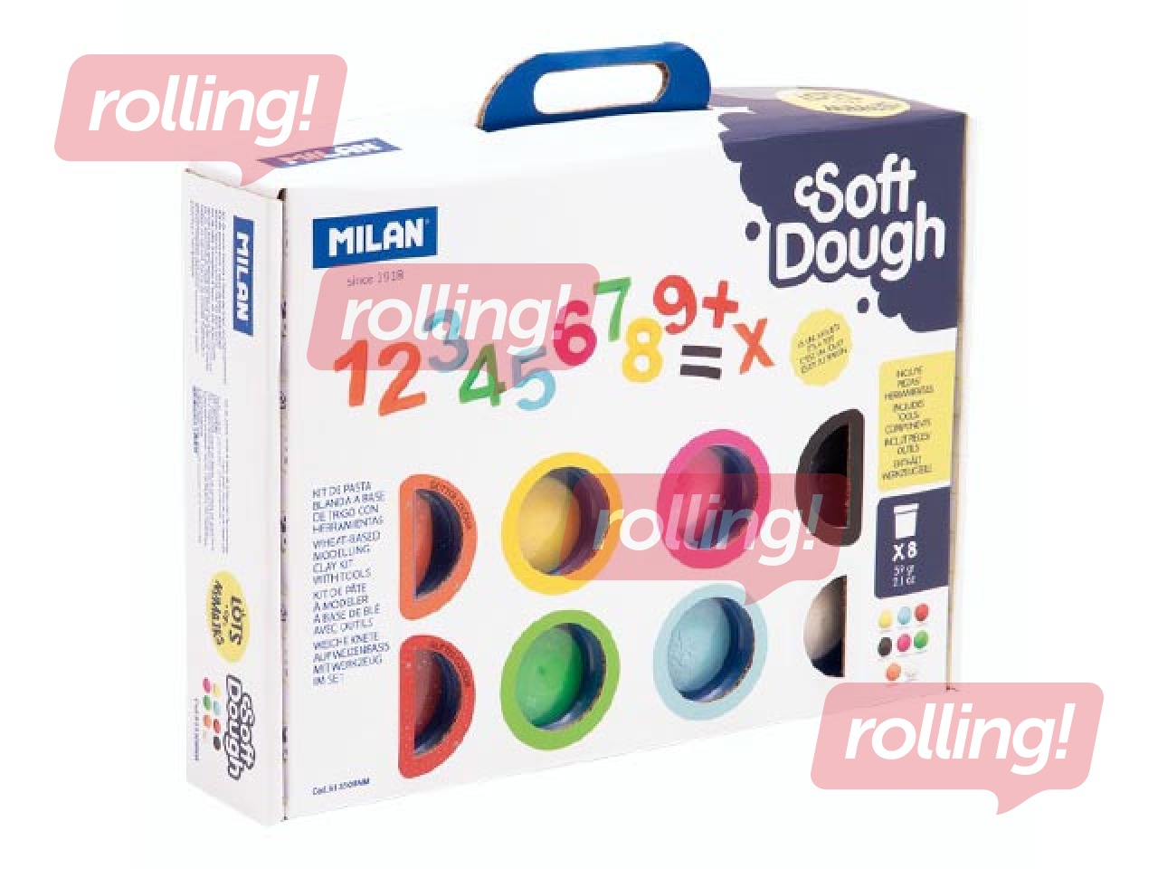Modelēšanas masas komplekts uz kviešu bāzes "Cipari". Komplekta saturs: 8 krāsas pa 59 g (balta, dzeltena, oranža, sarakana, gaiši zila, zaļa, rozā un melna) un 26 skaitļu un matemātikas simbolu formas un 3 instrumenti. Mīkstā masa ir elastīga un viegli veidojama. Jaunas krāsas var izveidot apvienojot divas vai vairākas krāsas. Tas neatstāj atlikumus uz rokām. Augu izcelsmes sastāvdaļas (satur glutēnu).