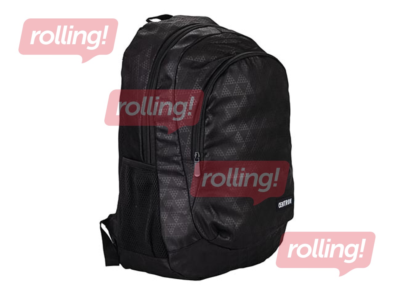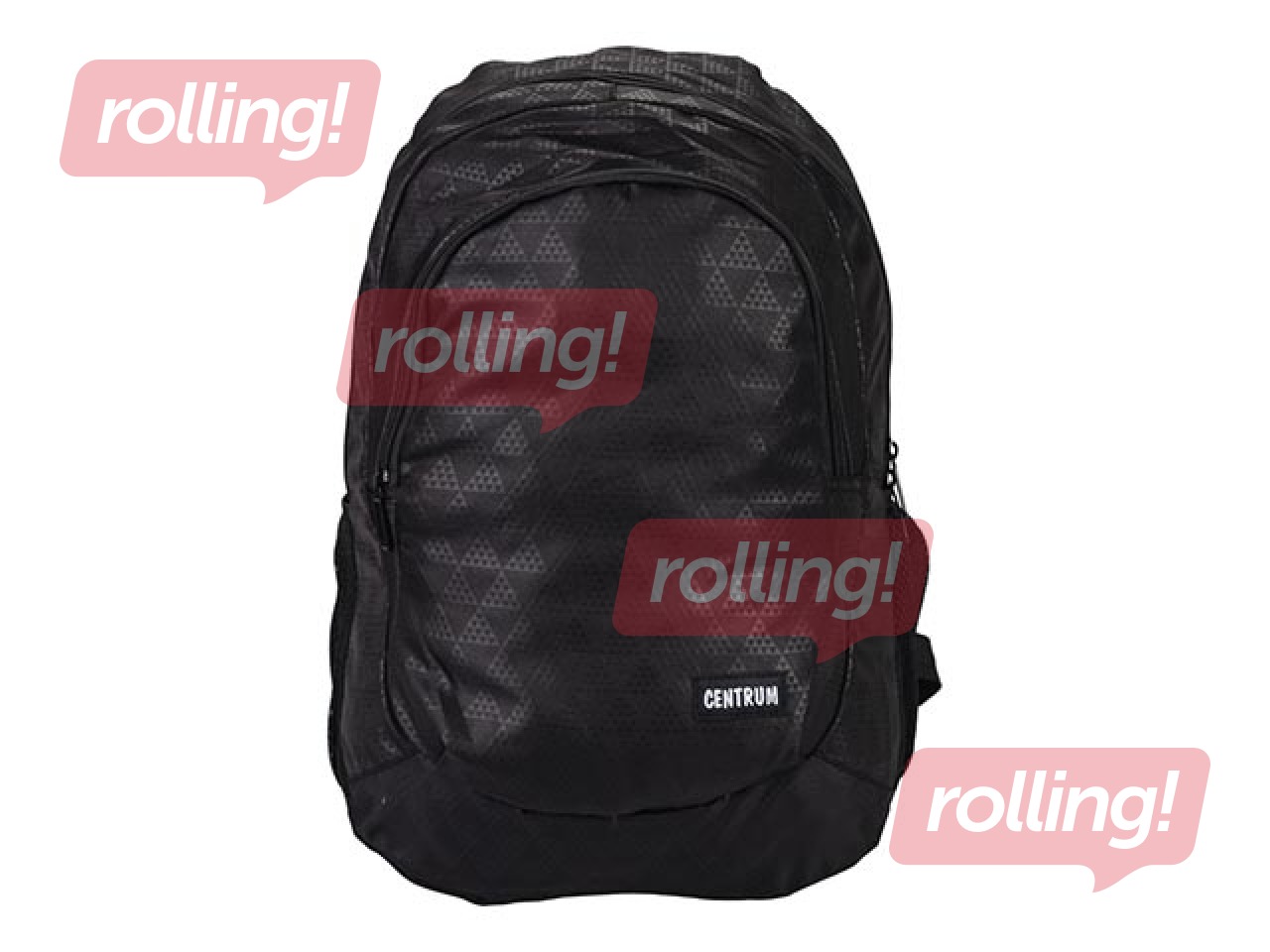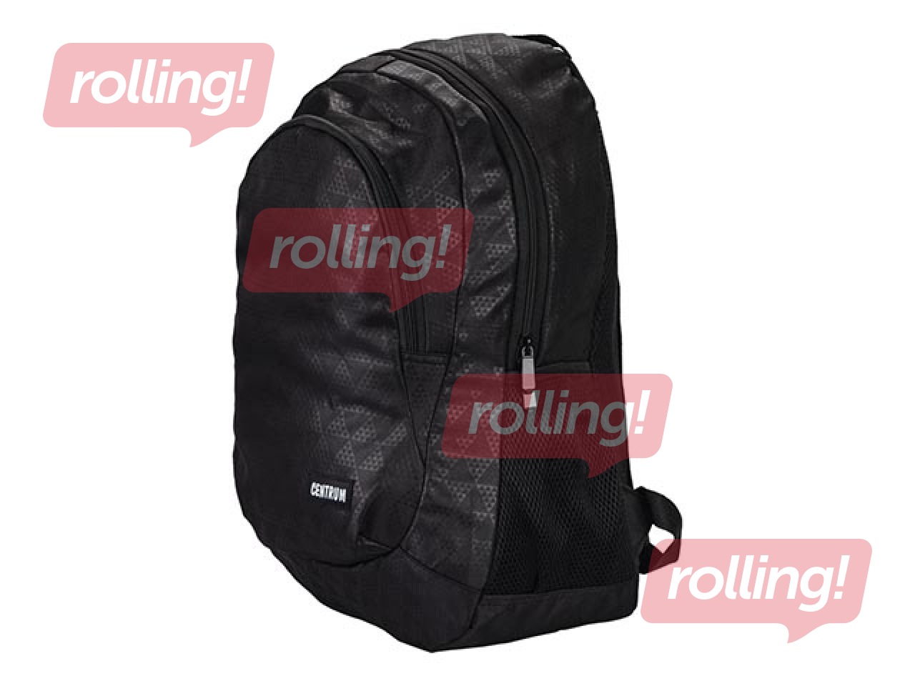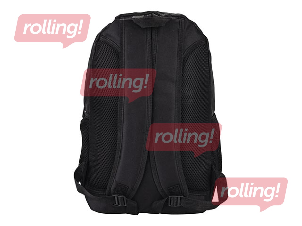 Mugursoma ar 2 rāvējslēdzējiem. Viens galvenais nodalījums, 1 priekšējā kabata. Melnā krāsā, regulējamas siksnas, polsterēta mugura. Sānu kabatas ūdens pudelēm.
