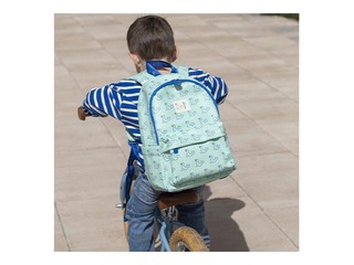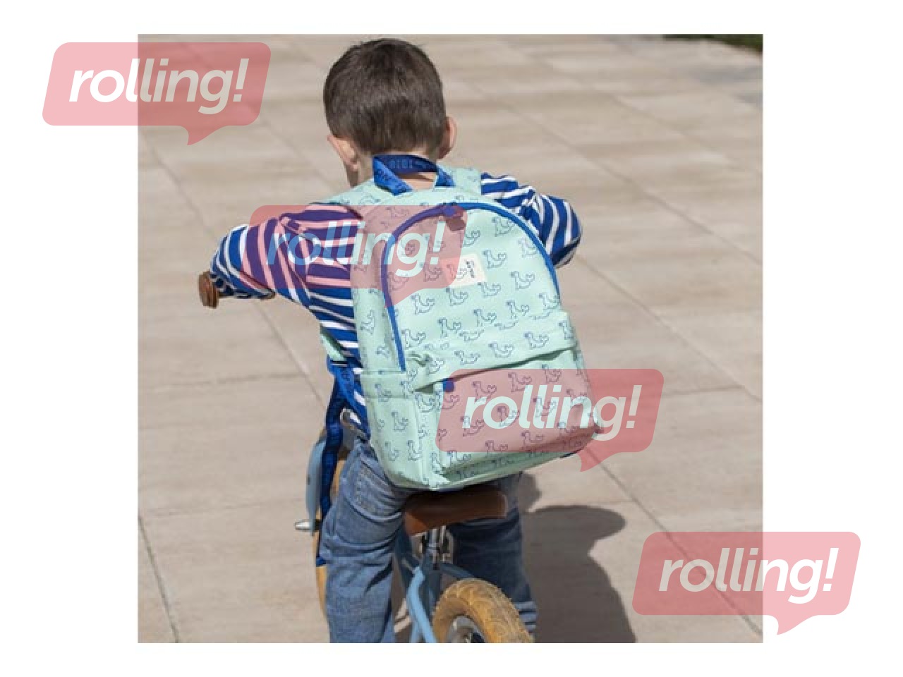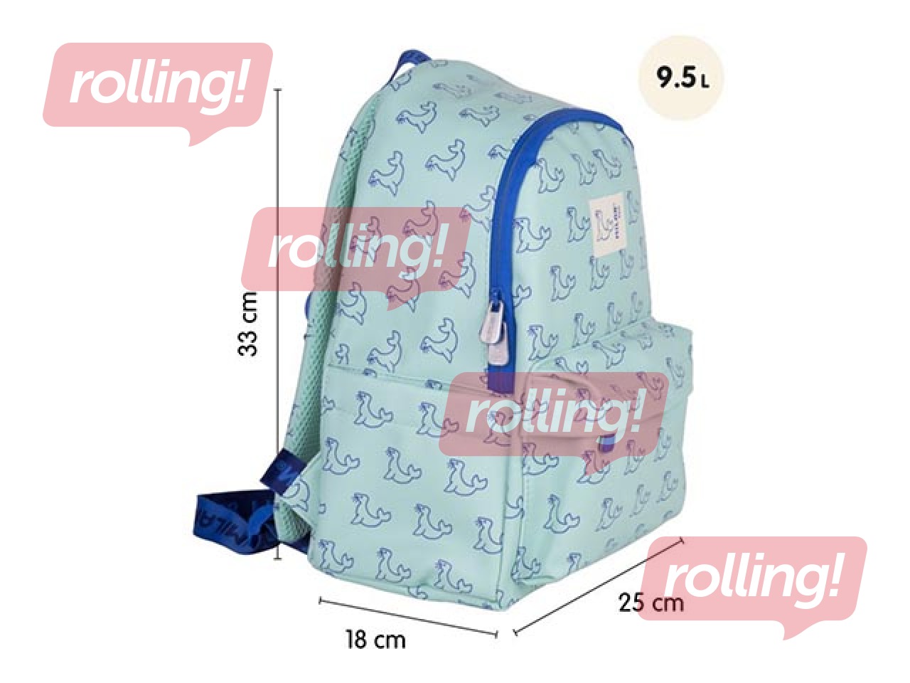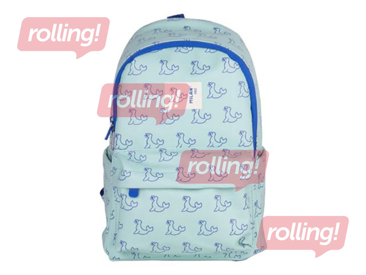 Neliela izmēra ikdienas mugursoma bērniem. Zaļā krāsa, ar tumši zilu vaļa rakstu. Iedvesmojoties no MILAN dzēšgumiju oriģinālajām krāsām un dizaina, kas ražotas Spānijā kopš 1918. gada. Galvenais un priekšējais nodalījums ar rāvējslēdzēja aizdari. Divas sānu kabatas pudelēm vai maziem priekšmetiem. Regulējamas plecu siksnas un priekšpusē regulējamas siksnas zilā krāsā. Iekšējā odere zilā krāsā.