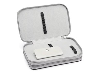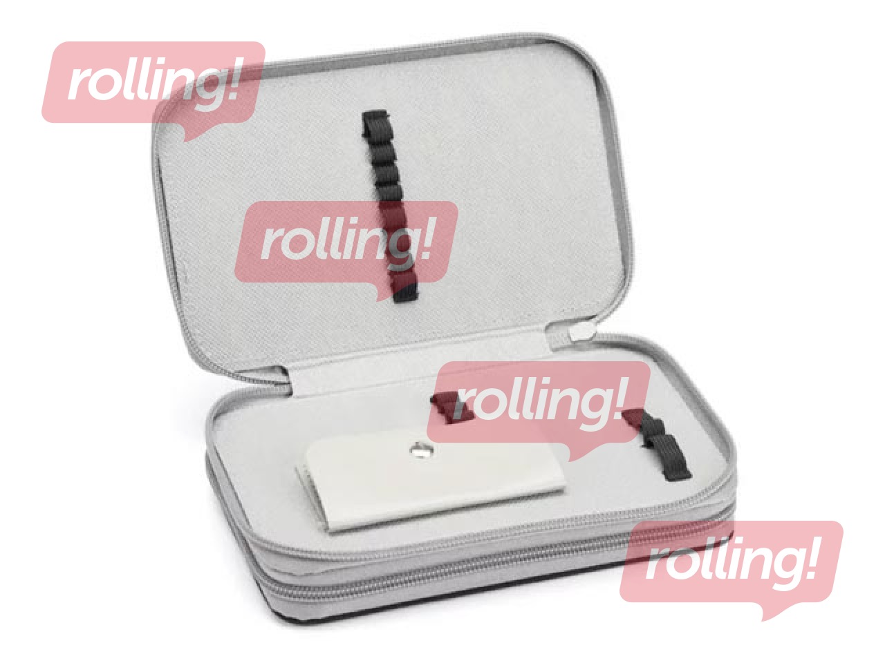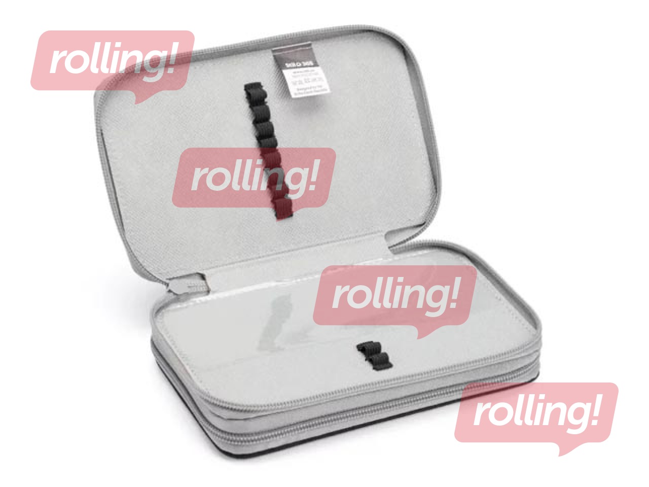 8 cilpas krītiņiem, 2 cilpas zīmuļiem un viena lielāka pildspalvai pirmajā nodalījumā, kabata sīkumiem, ko var aizvērt.