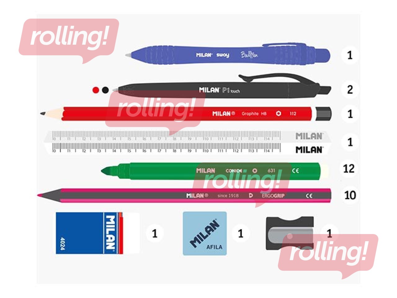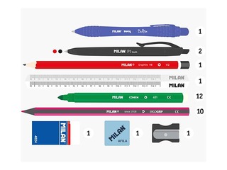 Sastāvs: 1 dzēšgumija 4024, 2 zīmuļu asināmie ( AFILA un MAXI), 1 HB grafīta zīmulis, 2 P1 pildspalvas (melna un sarkana), 1 zila SWAY pildspalva, 1 lineāls 15 cm, 10 Ergo krāsaini zīmuļi, 12 flomasteri.
