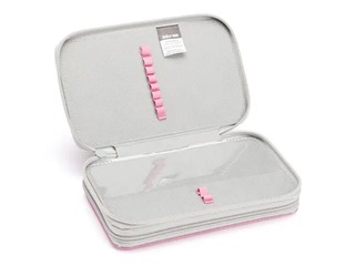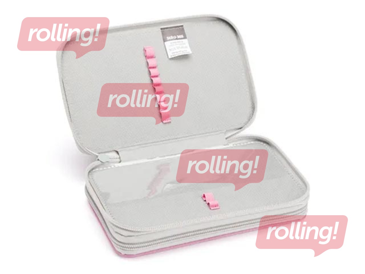 Pirmajā nodalījumā ir 8 cilpas krītiņiem, 2 cilpas zīmuļiem un viena lielāka pildspalvai, kā arī neliela kabatiņa sīkumiem, kas aizverama.