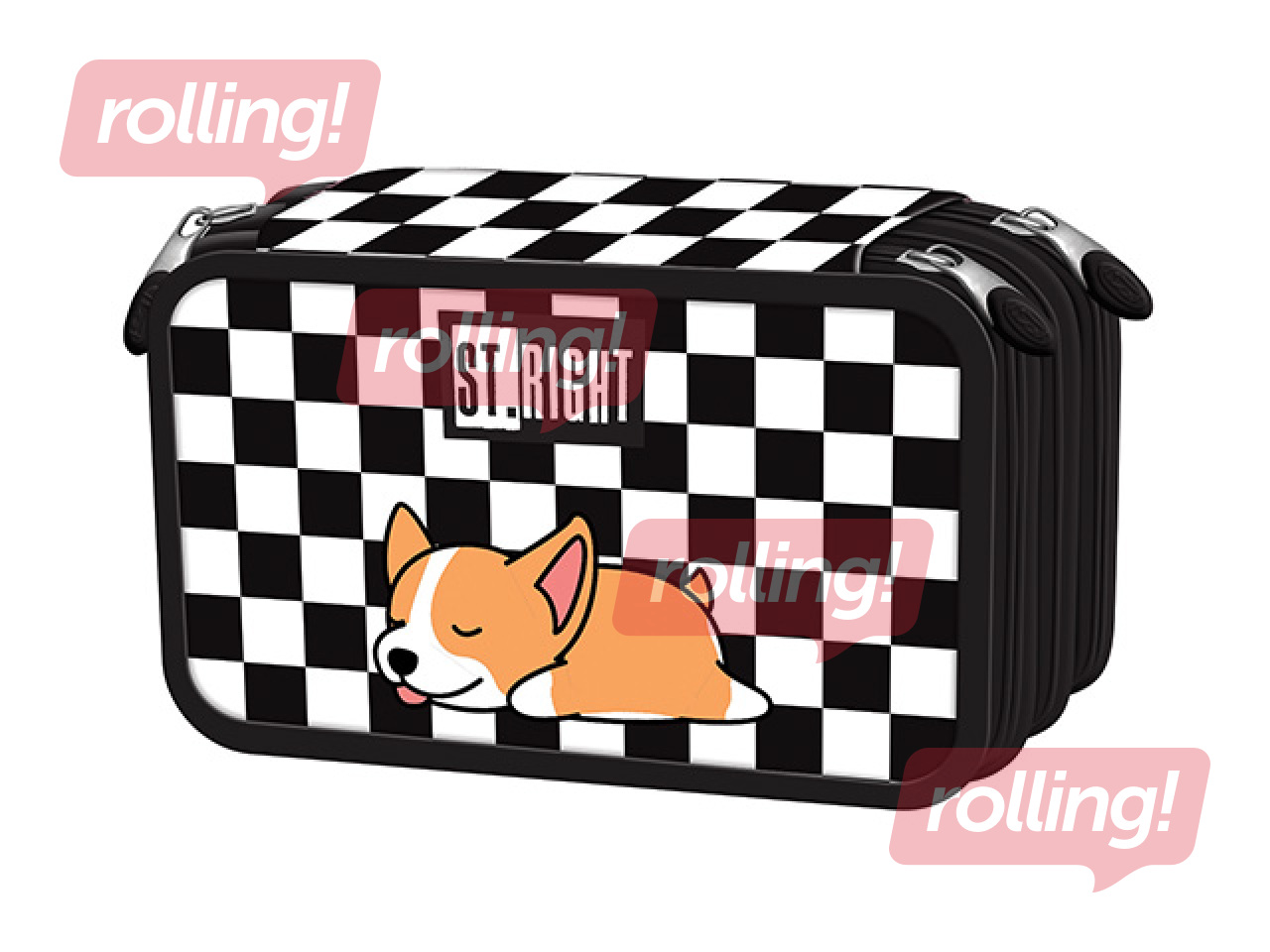 Penālis St.Right "Sleepy Corgi" — 3 nodalījumi, komplektā visi nepieciešamie piederumi (zīmuļi, pildspalvas, dzēšgumija, lineāls u.c.). Stilīgs un praktisks risinājums skolēniem.