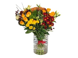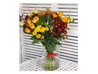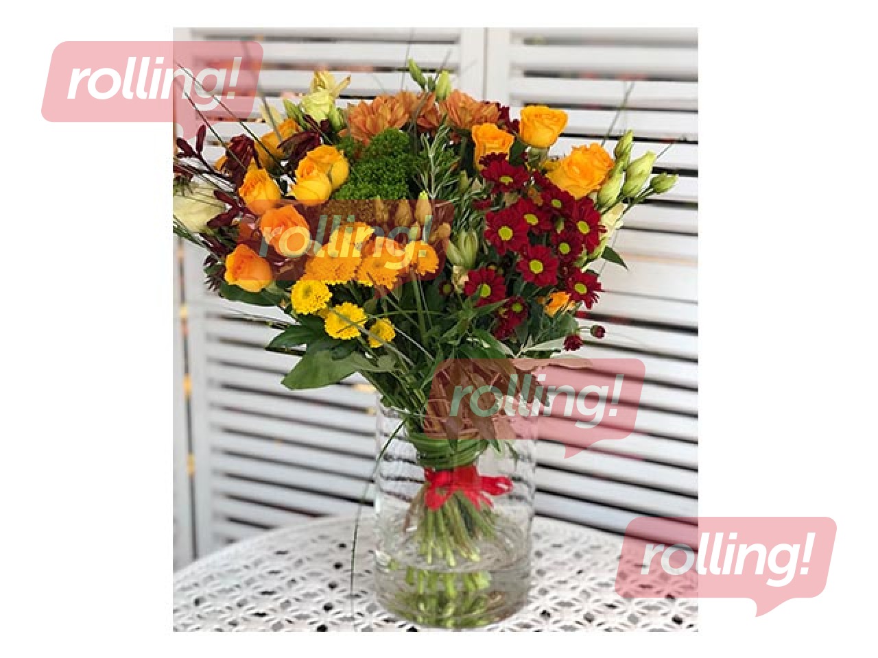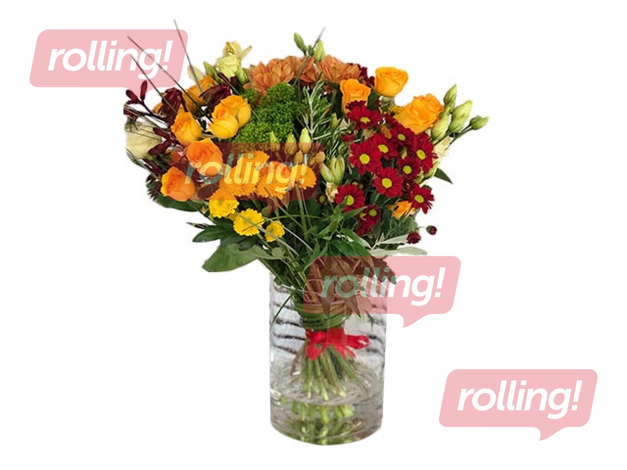 Ziedu pušķis ar krizantēmām, rozēm, lizantēm (diametrs apm. 35cm)