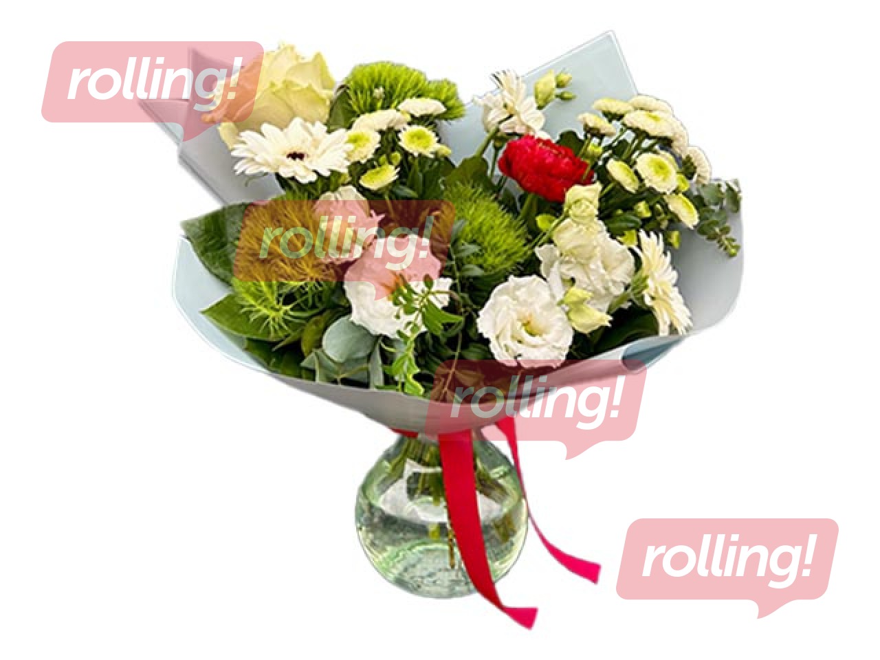Šis elegantais ziedu pušķis apvieno gerberas, neļķes, lizantes, rozes un citus sezonālus ziedus, veidojot krāšņu un daudzveidīgu kompozīciju. Pušķis izceļas ar košām un dzīvīgām krāsām, kas rada spilgtu atmosfēru jebkuram svētku mirklim vai īpašam notikumam. Ar diametru apmēram 49cm, tas ir ideāli piemērots, lai padarītu jebkuru telpu vai svinības vēl krāšņākas un patīkamākas. 3 gerberas, 3 neļķes, 1 roze, 3 lizantes, 7 citi ziedi un zaļumi.