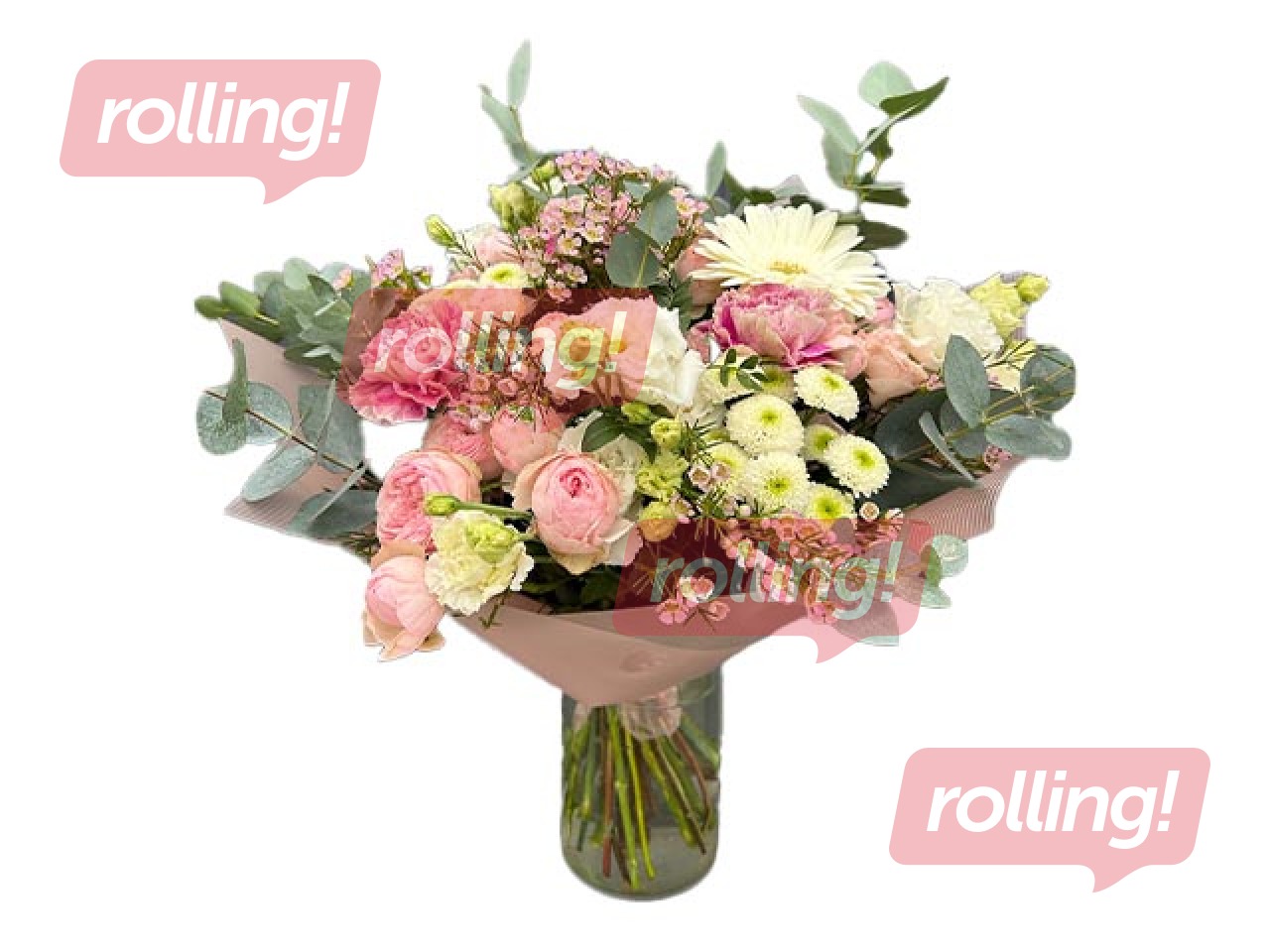 Ziedu pušķis no krūmrozēm, lizantēm, krizantēmām, neļķēm un citiem ziediem un zaļumiem, Ø52cm