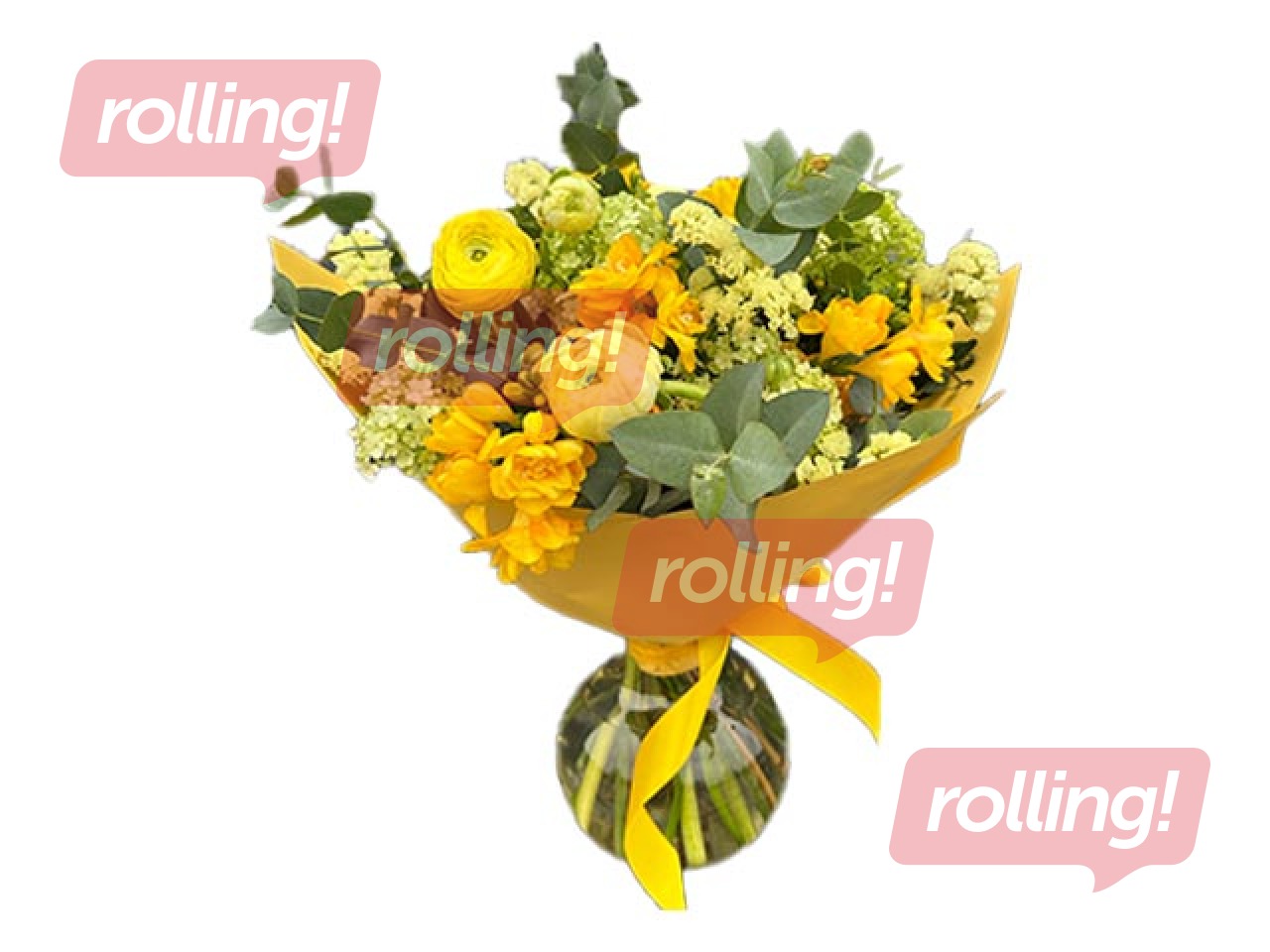 Ziedu pušķis no ranunkuļiem, frēzijām un citiem ziediem un zaļumiem, Ø40cm