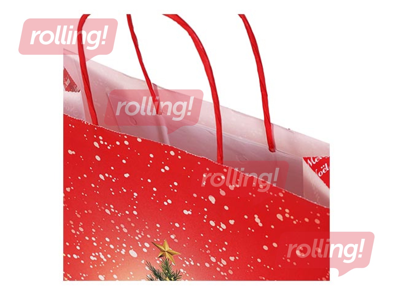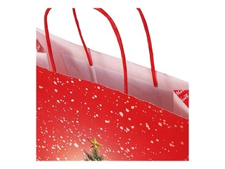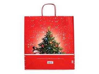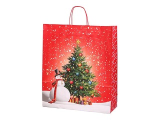 Papīra dāvanu maisiņš ar sarkaniem rokturiem un dizainu ar sniegavīru.